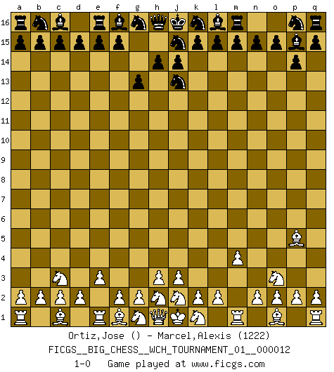 Last move : 1-0 2018 November 12 7:2:2 [Event "FICGS__BIG_CHESS__WCH_TOURNAMENT_01__000012"] [Site "FICGS"] [Date "2018.11.02"] [Round "1"] [White "Ortiz,Jose"] [Black "Marcel,Alexis"] [Result "1-0"] [WhiteElo ""] [BlackElo "1222"] 1.p1-o3 p15-p14 2.m2-m4 h15-j13 3.l1-p5 o16-p15 4.e2-e3 g15-g13 5.b1-c3 1-0 Follow this game move after move (download)You may learn much more from a game you lose than from a game you win. You will have to lose hundreds of games before becoming a good player. (Jose Raul Capablanca) Offener Brief an US-Präsident Bush anlässlich der Verhaftung Bobby Fishers: Verhaften Sie mich. Stecken Sie mich in dieselbe Zelle wie Bobby Fisher und geben Sie uns ein Schachspiel mit. (Boris Vassilievich Spassky) El jugador de combinación piensa hacia adelante; comienza de la posición dada y trabaja las movidas contundentes en su mente. (Emanuel Lasker) Le succès, c'est être capable d'aller d'échec en échec sans perdre son enthousiasme. (Winston Churchill) The only thing that matters is the evidence. (Horatio Caine, C.S.I. Miami)