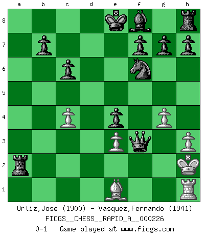 Last move : 0-1 2019 February 4 3:22:0 [Event "FICGS__CHESS__RAPID_A__000226"] [Site "FICGS"] [Date "2018.11.02"] [Round "1"] [White "Ortiz,Jose"] [Black "Vasquez,Fernando"] [Result "0-1"] [WhiteElo "1900"] [BlackElo "1941"] 1.c4 e5 2.e3 Nf6 3.Be2 Nc6 4.b3 d5 5.Qc2 d4 6.Bb2 Nb4 7.Qc1 Bf5 8.a3 Nc2+ 9.Kf1 Nxa1 10.Bxa1 c6 11.h3 Qb6 12.b4 a5 13.c5 Qa7 14.d3 axb4 15.Bb2 Qxc5 16.Nf3 Qxc1+ 17.Bxc1 bxa3 18.g4 a2 19.Nbd2 a1Q 20.Kg2 Be6 21.Nc4 Bxc4 22.Bd2 Qb2 23.dxc4 dxe3 24.fxe3 e4 25.Be1 Qxe2+ 26.Kg3 Qxf3+ 27.Kh2 Ra2+ 0-1 English Opening Promotion Queen by player Black (move 19) Player Black won this chess game. Follow this game move after move (download)If Chess is a science, it's a most inexact one. If Chess is an art, it is too exacting to be seen as one. If Chess is a sport, it's too esoteric. If Chess is a game, it's too demanding to be just a game. If Chess is a mistress, she's a demanding one. If Chess is a passion, it's a rewarding one. If Chess is life, it's a sad one. (Unknown) Weshalb minderdergeübte Spieler mit g2-g4 beginnen? Die betreffenden sind unschlüssig, ob sie nun rechts (h4) oder links (f4) beginnen sollen, und in ihrer Ratlosigkeit entschliessen sie sich nach guter Bürgerart dazu, den goldenen Mittelweg zu wählen. (Aaron Nimzowitsch) En el Ajedrez, cuando menos, el valiente hereda la tierra. (Edmar Mednis) Roi des jeux et jeu des rois, les échecs portent en eux un sentiment d'infini. Ils donnent à celui qui s'est efforcé d'en approfondir les arcanes l'impression de n'être pas à la mesure de l'homme; en fait, ils constituent un résumé de l'univers, un microcosme, et figurent cette grande échelle qui, dans les plans de la lumière descend jusqu'à la matière, qui des abîmes insondables remonte jusqu'en l'infini de Dieu. (Pyrame) Even the best needles are not sharp at both ends. (Chinese proverb)