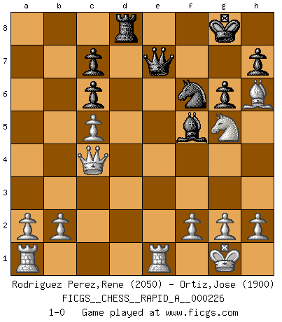 Last move : 1-0 2019 January 15 2:15:44 [Event "FICGS__CHESS__RAPID_A__000226"] [Site "FICGS"] [Date "2018.11.02"] [Round "1"] [White "Rodriguez Perez,Rene"] [Black "Ortiz,Jose"] [Result "1-0"] [WhiteElo "2050"] [BlackElo "1900"] 1.e4 Nc6 2.Nf3 e5 3.Bb5 Bc5 4.c3 Nge7 5.O-O O-O 6.d4 exd4 7.cxd4 a6 8.Bxc6 dxc6 9.dxc5 Bd7 10.Nd4 f5 11.Qb3+ Kh8 12.Qxb7 g6 13.Nc3 fxe4 14.Bg5 Rb8 15.Qxa6 Ra8 16.Qc4 Qe8 17.Nxe4 Nd5 18.Nf3 Bf5 19.Qd4+ Kg8 20.Bh6 Rf7 21.Neg5 Nf6 22.Nxf7 Qxf7 23.Ng5 Qe7 24.Rfe1 Rd8 25.Qc4+ 1-0 KP : Nimzovich defense Kingside Castling by player White (move 5) Kingside Castling by player Black (move 5) Player White won this chess game. Follow this game move after move (download)Many Chess players were surprised when after the game, Fischer quietly explained: 'I had already analyzed this possibility' in a position which I thought was not possible to foresee from the opening. (Mikhail Tal) Ein Isolani verdüstert die Stimmung auf dem ganzen Schachbrett. (Savielly Grigorievitsch Tartakower) Una clavada es mas poderosa que una espada. (Fred Reinfeld) Tout change constamment, y compris dans le monde des Echecs. (Botvinnik) Nothing is more important for teaching us to understand the concepts we have than constructing fictitious ones. (Ludwig Wittgenstein)