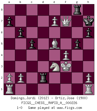 Last move : 1-0 2019 January 26 5:17:51 [Event "FICGS__CHESS__RAPID_A__000226"] [Site "FICGS"] [Date "2018.11.02"] [Round "1"] [White "Domingo,Jordi"] [Black "Ortiz,Jose"] [Result "1-0"] [WhiteElo "2012"] [BlackElo "1900"] 1.e4 Nc6 2.Nf3 e5 3.Bc4 Bc5 4.c3 d6 5.d4 exd4 6.cxd4 Bb4+ 7.Kf1 h6 8.d5 Nce7 9.Qa4+ c6 10.Qxb4 c5 11.Qb3 b6 12.e5 Nf5 13.Bb5+ Bd7 14.g4 Nh4 15.Bxd7+ Qxd7 16.Nxh4 dxe5 17.Nf5 f6 18.Nc3 g6 19.Ne3 Rd8 20.Kg2 Ne7 21.Bd2 O-O 22.d6 Kg7 23.dxe7 Qxe7 24.Ncd5 Qd6 25.Bc3 f5 26.f4 Kh7 27.Bxe5 Qe6 28.gxf5 Rxd5 29.fxe6 Rd2+ 30.Kf3 g5 31.e7 Rg8 32.Qf7+ 1-0 KP : Nimzovich defense Kingside Castling by player Black (move 21) Player White won this chess game. Follow this game move after move (download)Life is like a game of Chess, changing with each move. (Chinese proverb) Ein Springer auf f6 gegen die eigene Rochadestellung ist schlimmer als ein rostiger Nagel im Knie. (Efim Bogoljubov) En el tablero, la mentira e hipocresía no sobreviven mucho. (Emanuel Lasker) Il s'avisa de me proposer d'apprendre les échecs qu'il jouait un peu... me voilà forcené des échecs. J'achète un échiquier, je m'enferme dans ma chambre, j'y passe des jours et des nuits à vouloir apprendre par cur toutes les parties. (Jean-Jacques Rousseau, Confessions) May I never be complete. May I never be content. May I never be perfect. Deliver me, Tyler, from being perfect and complete. (Chuck Palahniuk, Fight Club)