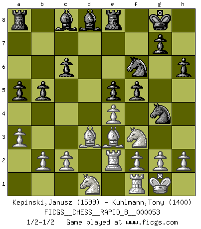 Last move : 1/2-1/2 2007 July 1 20:5:31 [Event "FICGS__CHESS__RAPID_B__000053"] [Site "FICGS"] [Date "2007.05.23"] [Round "1"] [White "Kepinski,Janusz"] [Black "Kuhlmann,Tony"] [Result "1/2-1/2"] [WhiteElo "1599"] [BlackElo "1400"] 1.e4 d6 2.d4 Nf6 3.Nc3 e5 4.Bg5 Be7 5.dxe5 dxe5 6.Qxd8+ Bxd8 7.Nf3 Nbd7 8.Bc4 c6 9.O-O O-O 10.Rad1 b5 11.Bd3 Re8 12.a3 a5 13.Rd2 h6 14.Be3 Ng4 15.Nd1 f5 16.Re2 Ndf6 17.Bc5 Nd7 18.Be3 Ndf6 1/2-1/2 Pirc defense Kingside Castling by player White (move 9) Kingside Castling by player Black (move 9) This chess game ended in a draw. Follow this game move after move (download)Life is a kind of Chess, with struggle, competition, good and ill events. (Benjamin Franklin) Ein unbeabsichtigtes Patt ist der Gipfel der Dummheit. (Anonymous) Una buena ofensiva y una buena defensa, comienzan ambas con un buen desarrollo. (Bruce A. Moon) Ce qui caractérise les parties de combat, c'est que si le défenseur a constamment de difficiles problèmes à résoudre, l'attaquant doit chercher sans relâche de nouvelles possibilités d'attaque. (Koblentz) Employ the attack like tactic of defense. (Chinese proverb)