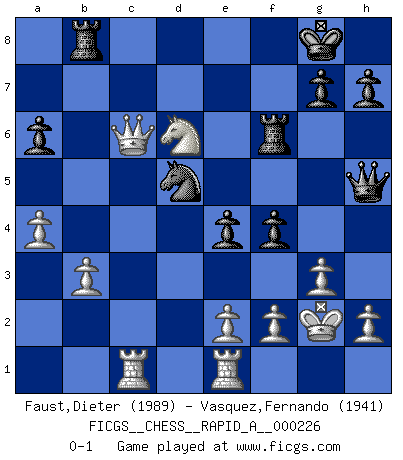 Last move : 0-1 2019 February 9 15:32:55 [Event "FICGS__CHESS__RAPID_A__000226"] [Site "FICGS"] [Date "2018.11.02"] [Round "1"] [White "Faust,Dieter"] [Black "Vasquez,Fernando"] [Result "0-1"] [WhiteElo "1989"] [BlackElo "1941"] 1.d4 Nf6 2.Nf3 e6 3.c4 d5 4.g3 Be7 5.Bg2 O-O 6.O-O dxc4 7.Qc2 a6 8.a4 Nc6 9.Qxc4 Qd5 10.Qd3 Qf5 11.Qc4 Na5 12.Qa2 c5 13.dxc5 Bxc5 14.Bd2 Nc6 15.Nh4 Qg4 16.Bf3 Qh3 17.Bg2 Qg4 18.Bf3 Qd4 19.Bxc6 bxc6 20.Be3 Qd6 21.Bxc5 Qxc5 22.Na3 Rb8 23.Rac1 Qh5 24.b3 e5 25.Nc4 Nd5 26.Ng2 Bh3 27.Rfe1 Bxg2 28.Kxg2 e4 29.Qc2 f5 30.Nd6 Rf6 31.Qxc6 f4 0-1 Queen's pawn game Kingside Castling by player Black (move 5) Kingside Castling by player White (move 6) Player Black won this chess game. Follow this game move after move (download)All I want to do, ever, is just play Chess. (Bobby Fischer) Kritik überlasse ich den Spießern. Ich zeige nichts, wofür ich mich schämen muss. (Alexandra Kosteniuk) El Ajedrez es una manera fabulosa para que los niños aprendan a autovalorarse y a autoestimarse. (Saudin Robovic) En blitz, le Cavalier l'emporte sur le Fou. (Vlastimil Hort) He who laughs last probably does not get the joke. (Unknown)