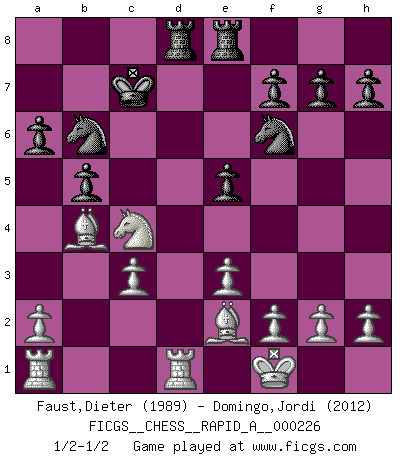 Last move : 1/2-1/2 2019 February 1 17:59:26 [Event "FICGS__CHESS__RAPID_A__000226"] [Site "FICGS"] [Date "2018.11.02"] [Round "1"] [White "Faust,Dieter"] [Black "Domingo,Jordi"] [Result "1/2-1/2"] [WhiteElo "1989"] [BlackElo "2012"] 1.d4 d5 2.c4 dxc4 3.e3 Nf6 4.Bxc4 e6 5.Nf3 c5 6.O-O a6 7.Nc3 b5 8.Be2 Bb7 9.dxc5 Qxd1 10.Rxd1 Bxc5 11.Nd2 Nbd7 12.Nb3 Bb4 13.Rd4 Bxc3 14.bxc3 Bd5 15.Ba3 Nb6 16.Na5 e5 17.R4d1 O-O-O 18.Kf1 Rhe8 19.Bc5 Kc7 20.Bb4 Bc4 21.Nxc4 1/2-1/2 Queen's gambit accepted Kingside Castling by player White (move 6) Queenside Castling by player Black (move 17) This chess game ended in a draw. Follow this game move after move (download)The passed pawn is a criminal, who should be kept under lock and key. Mild measures, such as police surveillance, are not sufficient. (Nimzovitch) Offensichtlich kennt Kasparow nichts anderes als Schach, und ich könnte 500 weitere Spieler dieser Sorte benennen. (Judith Polgar) Un Peón pasado es un criminal, quién debe ser mantenido bajo candado y llave. Leves medidas, tales como vigilancia policiaca, no son suficientes. (Aaron Nimzovich) Mon pion favori sur ma case favorite ! Bronstein en parlant d'un coup de pion en h5 quand il avait les Noirs. The Internet isn't free. It just has an economy that makes no sense to capitalism. (Brad Shapcott)