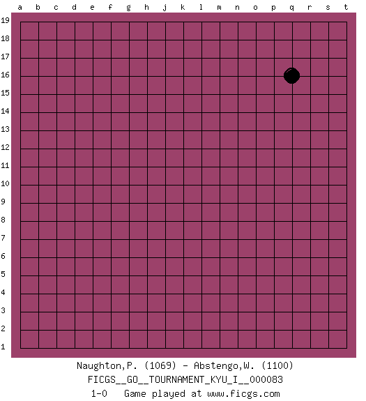 Last move : 1-0 2018 December 5 0:19:33 [Event "FICGS__GO__TOURNAMENT_KYU_I__000083"] [Site "FICGS"] [Date "2018.11.04"] [Round "1"] [Black "Naughton,Patrick"] [White "Abstengo,William"] [Result "1-0"] [Rating 1 "1069"] [Rating 2 "1100"] 1.q16 1-0 This go game has been lost on time (started : 2018.11.04 21:39:43) Here are the names of the openings (joseki) played in the four corners : Player Black won this Go (weiqi, baduk) game. Follow this game move after move (download)When you study joseki, you lose two stones in strength. (Anonymous) It is not titles that honor men, but men that honor titles. (Niccolo Machiavelli)