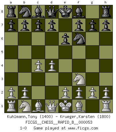 Last move : 1-0 2007 June 25 8:51:37 [Event "FICGS__CHESS__RAPID_B__000053"] [Site "FICGS"] [Date "2007.05.23"] [Round "1"] [White "Kuhlmann,Tony"] [Black "Krueger,Karsten"] [Result "1-0"] [WhiteElo "1400"] [BlackElo "1800"] 1.d4 Nf6 2.c4 e6 3.Nf3 1-0 This chess game has been lost on time (started : 2007.05.23 22:9:31) Queen's pawn game Player White won this chess game. Follow this game move after move (download)Up to this point White has been following well-known analysis. But now he makes a fatal error: he begins to use his own head. (Siegbert Tarrasch) Ihnen, Herr Lasker, habe ich nur drei Worte zu sagen: Schach und matt. (Siegbert Tarrasch) Ser exitoso en el Ajedrez te permite descubrir tu propia personalidad. Eso es lo que deseo para los niños de mi clase. (Saudin Robovic) Votre prénom est 'Tactique', votre deuxième prénom est 'Tactique' et votre nom est 'Tactique'. (Ken Smith) Knowledge rests not upon truth alone, but upon error also. (Carl G. Jung)