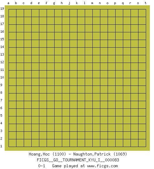 Last move : 0-1 2018 December 5 0:19:33 [Event "FICGS__GO__TOURNAMENT_KYU_I__000083"] [Site "FICGS"] [Date "2018.11.04"] [Round "1"] [Black "Hoang,Hoc"] [White "Naughton,Patrick"] [Result "0-1"] [Rating 1 "1100"] [Rating 2 "1069"] 0-1 This go game has been lost on time (started : 2018.11.04 21:39:43) Here are the names of the openings (joseki) played in the four corners : Player White won this Go (weiqi, baduk) game. Follow this game move after move (download)The simplest move is the best move. (Anonymous) Creativity is inventing, experimenting, growing, taking risks, breaking rules, making mistakes, and having fun. (Mary Lou Cook)
