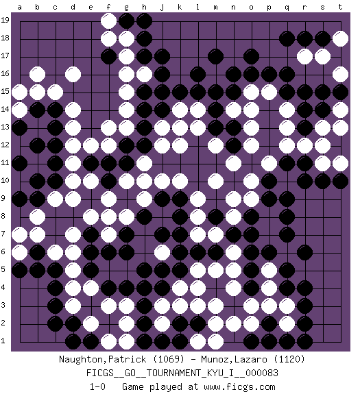 Last move : 1-0 2019 January 29 5:29:25 [Event "FICGS__GO__TOURNAMENT_KYU_I__000083"] [Site "FICGS"] [Date "2018.11.04"] [Round "1"] [Black "Naughton,Patrick"] [White "Munoz,Lazaro"] [Result "1-0"] [Rating 1 "1069"] [Rating 2 "1120"] 1.q16 d4 2.q4 o3 3.r6 d16 4.f17 d10 5.j16 d14 6.r14 k4 7.q9 d7 8.o17 g15 9.j14 k10 10.h12 h10 11.g11 g10 12.f11 g13 13.h13 o9 14.f10 g8 15.c12 d12 16.c10 d11 17.c11 c9 18.b14 b16 19.b9 b8 20.b10 d9 21.c13 d13 22.b12 a12 23.a11 a14 24.a13 a15 25.c3 d3 26.c4 d5 27.c5 c6 28.d2 e2 29.c2 f3 30.b6 b7 31.b5 q3 32.r3 q2 33.r2 p4 34.q5 g17 35.h17 h16 36.j17 g18 37.h18 m16 38.l15 m15 39.m14 n14 40.n15 o14 41.n16 l14 42.m13 k14 43.k15 k12 44.m17 r12 45.r11 q12 46.m8 m10 47.o8 p8 48.p9 n8 49.o7 n9 50.n7 m7 51.m6 l7 52.l6 p7 53.p6 n6 54.o6 n5 55.o5 n4 56.q7 q14 57.r15 k13 58.k7 l8 59.k5 l4 60.k8 l9 61.g6 h4 62.j5 j6 63.e6 d6 64.f8 f7 65.e7 f9 66.g7 e8 67.f6 f8 68.h8 j8 69.j9 h9 70.j7 j10 71.k9 l5 72.k6 m12 73.n13 o12 74.n12 o13 75.o11 n11 76.l16 p11 77.j4 j3 78.h3 g3 79.h2 j2 80.g4 q10 81.r10 s13 82.s14 s11 83.s10 t11 84.t10 t14 85.t15 t13 86.r13 s12 87.p10 o10 88.q11 q13 89.q15 f12 90.f4 m5 91.o4 h11 92.g12 f13 93.h14 o15 94.o16 p15 95.p16 l13 96.m15 t16 97.s15 r17 98.s18 s17 99.r18 t18 100.q18 p3 101.n3 m3 102.l2 m2 103.k2 k3 104.j1 g2 105.h1 g1 106.h5 l3 107.k1 b15 108.c14 c15 109.e5 g14 110.g19 f19 111.h19 f18 112.q1 p1 113.r1 j12 114.e11 e12 115.e1 f1 116.d1 m1 117.h15 g16 118.j15 l1 119.h4 p5 120.q8 e4 121.o1 n2 122.p2 o2 123.p1 e10 124.a9 a6 125.a5 a7 126.r4 j13 127.pass 1-0 Comment by player 1 : Patrick Naughton : To you too sir.. Comment by player 2 : Lazaro Munoz : Happy New Year! Here are the names of the openings (joseki) played in the four corners : Corner q4 : q4 o3 Hoshi (Hwajeom, Seongjeom, Xingwei`) 4-4 Point. The star or hoshi (4-4) point, emphasizing influence at the potential expense of territory. Ikken Kakari (Hankan Keolch'im, Yi Gua`jiao~, 1-Space Low Approach). White 2 is the standard approach move to the 4-4. Corner d16 : d16 f17 Hoshi (Hwajeom, Seongjeom, Xingwei`) 4-4 Point. The star or hoshi (4-4) point, emphasizing influence at the potential expense of territory. Ikken Kakari (Hankan Keolch'im, Yi Gua`jiao~, 1-Space Low Approach). Black 2 is the standard approach move to the 4-4. Player Black won this Go (weiqi, baduk) game. Follow this game move after move (download)Proverbs do not apply to White. (Tero Sand) The only difference between a tax man and a taxidermist is that the taxidermist leaves the skin. (Mark Twain)