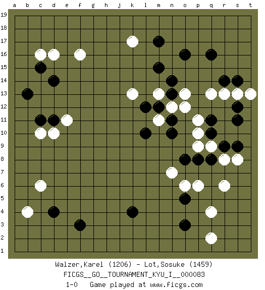 Last move : 1-0 2019 February 6 19:34:13 [Event "FICGS__GO__TOURNAMENT_KYU_I__000083 "] [Site "FICGS"] [Date "2018.11.04"] [Round "1"] [Black "Walzer,Karel "] [White "Lot,Sosuke "] [Result "1-0"] [Rating 1 "1206"] [Rating 2 "1459"] 1.d4 q4 2.q16 d16 3.o3 r6 4.q8 q2 5.o5 p6 6.q11 c6 7.f3 d10 8.d14 f16 9.c15 c16 10.c11 c10 11.d11 e11 12.b13 k17 13.k4 b4 14.m17 r13 15.r14 q13 16.s12 s13 17.s14 t13 18.s11 o13 19.o16 s8 20.o8 n7 21.n11 m13 22.m15 k13 23.n13 n12 24.n14 o12 25.m12 m11 26.l12 p10 27.q10 p9 28.s9 r8 29.r9 q9 30.n10 p11 31.l10 o6 32.p8 1-0 This go game has been lost on time (started : 2018.11.04 21:39:43) Here are the names of the openings (joseki) played in the four corners : Corner q4 : q4 o3Hoshi (Hwajeom, Seongjeom, Xingwei`) 4-4 Point. The star or hoshi (4-4) point, emphasizing influence at the potential expense of territory.Ikken Kakari (Hankan Keolch'im, Yi Gua`jiao~, 1-Space Low Approach). Black 2 is the standard approach move to the 4-4. Corner d4 : d4 c6Hoshi (Hwajeom, Seongjeom, Xingwei`) 4-4 Point. The star or hoshi (4-4) point, emphasizing influence at the potential expense of territory.Ikken Kakari (Hankan Keolch'im, Yi Gua`jiao~, 1-Space Low Approach). White 2 is the standard approach move to the 4-4. Corner d16 : d16 d14Hoshi (Hwajeom, Seongjeom, Xingwei`) 4-4 Point. The star or hoshi (4-4) point, emphasizing influence at the potential expense of territory.Ikken Takagakari (Hankan Nop'dakeolch'im, Yi Gaojia, 1-Space High Approach). White typically responds at 6-4 or 3-10. White 4-10 is played when White finds play on the right side advantageous. White 4-8 or 3-8 may be played when White has support at top. Player Black won this Go (weiqi, baduk) game.Follow this game move after move (download ) Big groups never die. (Anonymous) I have opinions of my own - strong opinions - but I don't always agree with them. (George Bush)