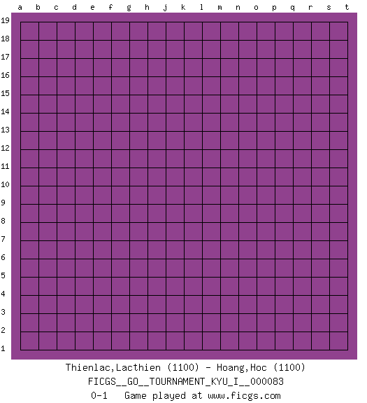Last move : 0-1 2018 December 5 0:19:33 [Event "FICGS__GO__TOURNAMENT_KYU_I__000083"] [Site "FICGS"] [Date "2018.11.04"] [Round "1"] [Black "Thienlac,Lacthien"] [White "Hoang,Hoc"] [Result "0-1"] [Rating 1 "1100"] [Rating 2 "1100"] 0-1 This go game has been lost on time (started : 2018.11.04 21:39:43) Here are the names of the openings (joseki) played in the four corners : Player White won this Go (weiqi, baduk) game. Follow this game move after move (download)Go is not a blocking game, it's a game of action. (Pierre Audouard) Begin at the beginning and go on till you come to the end; then stop. (Lewis Carrol, Alice in Wonderland)