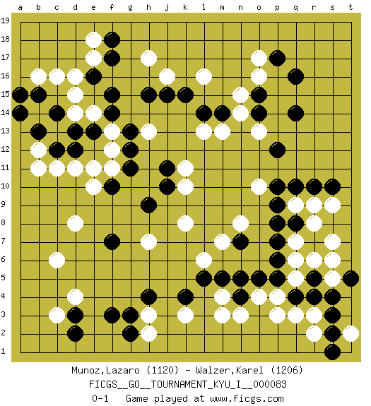 Last move : 0-1 2019 April 1 13:43:25 [Event "FICGS__GO__TOURNAMENT_KYU_I__000083"] [Site "FICGS"] [Date "2018.11.04"] [Round "1"] [Black "Munoz,Lazaro"] [White "Walzer,Karel"] [Result "0-1"] [Rating 1 "1120"] [Rating 2 "1206"] 1.q16 d4 2.q4 d16 3.q10 o17 4.p17 o16 5.q14 l16 6.f3 c6 7.k4 d11 8.f17 h17 9.f15 e14 10.f14 k10 11.f7 d8 12.f10 h13 13.e13 d14 14.d13 e17 15.f18 e18 16.e16 c16 17.h15 j16 18.j15 o4 19.o5 p4 20.p5 m4 21.n4 n3 22.n5 m3 23.m5 q3 24.r4 r3 25.s3 r2 26.s2 p3 27.d3 c3 28.d2 h3 29.h4 k3 30.g3 h2 31.g2 q7 32.p7 q5 33.r5 q6 34.p6 q9 35.p9 r9 36.r10 r6 37.s4 s6 38.t5 t2 39.s1 s5 40.q8 r8 41.p8 s9 42.s10 s7 43.c12 c11 44.c14 d15 45.b13 l13 46.o14 n14 47.l14 m13 48.m14 n15 49.o15 o13 50.k15 f13 51.g13 f12 52.g12 f11 53.g11 e10 54.b15 b16 55.a14 b11 56.a15 b12 57.d12 e11 58.p12 o10 59.p10 h7 60.h9 l6 61.l5 n8 62.j11 k11 63.j10 k8 64.n7 m7 0-1 Here are the names of the openings (joseki) played in the four corners : Corner q16 : q16 o17 Hoshi (Hwajeom, Seongjeom, Xingwei`) 4-4 Point. The star or hoshi (4-4) point, emphasizing influence at the potential expense of territory. Ikken Kakari (Hankan Keolch'im, Yi Gua`jiao~, 1-Space Low Approach). White 2 is the standard approach move to the 4-4. Corner d4 : d4 f3 Hoshi (Hwajeom, Seongjeom, Xingwei`) 4-4 Point. The star or hoshi (4-4) point, emphasizing influence at the potential expense of territory. Ikken Kakari (Hankan Keolch'im, Yi Gua`jiao~, 1-Space Low Approach). Black 2 is the standard approach move to the 4-4. Corner q4 : q4 o4 Hoshi (Hwajeom, Seongjeom, Xingwei`) 4-4 Point. The star or hoshi (4-4) point, emphasizing influence at the potential expense of territory. Ikken Takagakari (Hankan Nop'dakeolch'im, Yi Gaojia, 1-Space High Approach). Black typically responds at 6-4 or 3-10. Black 4-10 is played when Black finds play on the right side advantageous. Black 4-8 or 3-8 may be played when Black has support at top. Player White won this Go (weiqi, baduk) game. Follow this game move after move (download)I really believe that Go is destined to take the place of Chess as the leading intellectual game of the Occident, just as it has reigned supreme in the Orient for some four thousand years. (Edward Lasker, international chess master) There are more things in heaven and earth than practically anywhere else. (Unknown)