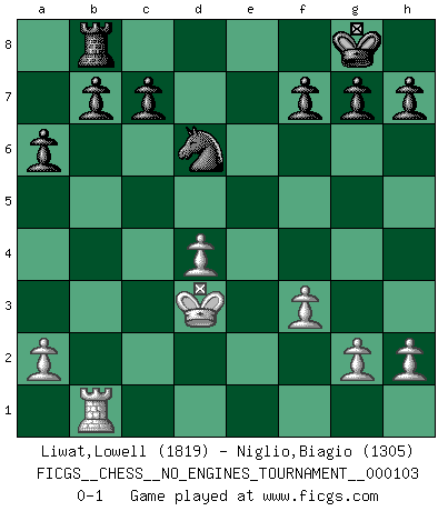 Last move : 0-1 2018 December 6 1:55:22 [Event "FICGS__CHESS__NO_ENGINES_TOURNAMENT__000103"] [Site "FICGS"] [Date "2018.11.05"] [Round "1"] [White "Liwat,Lowell"] [Black "Niglio,Biagio"] [Result "0-1"] [WhiteElo "1819"] [BlackElo "1305"] 1.d4 d5 2.c4 e5 3.cxd5 Qxd5 4.Nc3 Qxd4 5.Nf3 Qxd1+ 6.Nxd1 e4 7.Nd4 Bd7 8.Nc3 Bb4 9.Bd2 Bxc3 10.Bxc3 Nf6 11.f3 exf3 12.exf3 a6 13.Bd3 Nc6 14.O-O O-O 15.Bf5 Nxd4 16.Bxd7 Ne2+ 17.Kf2 Nxc3 18.bxc3 Nxd7 19.Rfd1 Nb6 20.Rab1 Rad8 21.Rd4 Rxd4 22.cxd4 Rb8 23.Ke3 Nc4+ 24.Kd3 Nd6 0-1 QGD : Albin counter-gambit Kingside Castling by player White (move 14) Kingside Castling by player Black (move 14) Player Black won this chess game. Follow this game move after move (download)The way he plays Chess demonstrates a man's whole nature. (Stanley Ellin) Man braucht nicht immer den besten Zug zu spielen: Ein Zug muß aktiv, unternehmungslustig, korrekt und schön sein. (David Bronstein) No todos los artistas son jugadores de Ajedrez, pero todos los jugadores de Ajedrez son artistas. (Marcel Duchamp) Aux échecs, l'amour-propre est satisfait quand on remporte la victoire, mais il n'y a pas de honte à être battu. (Benjamin Franklin) If we don't succeed, we run the risk of failure. (George W. Bush)