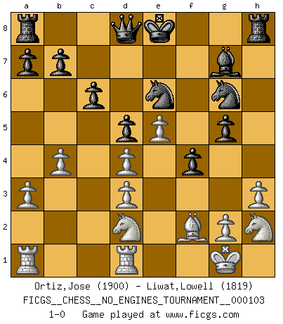 Last move : 1-0 2019 April 14 4:54:7 [Event "FICGS__CHESS__NO_ENGINES_TOURNAMENT__000103"] [Site "FICGS"] [Date "2018.11.05"] [Round "1"] [White "Ortiz,Jose"] [Black "Liwat,Lowell"] [Result "1-0"] [WhiteElo "1900"] [BlackElo "1819"] 1.Nf3 d5 2.d4 c6 3.e3 Bg4 4.Bd3 Nd7 5.O-O e5 6.Re1 e4 7.h3 Bh5 8.Nbd2 exd3 9.cxd3 Ne7 10.b4 f6 11.a3 g5 12.e4 h6 13.e5 f5 14.Nh2 Bxd1 15.Rxd1 Bg7 16.Ndf1 Nf8 17.f4 Neg6 18.fxg5 hxg5 19.Be3 f4 20.Bf2 Ne6 21.Nd2 1-0 Reti Opening Kingside Castling by player White (move 5) Player White won this chess game. Follow this game move after move (download)Is Bobby Fischer quite sane ? (Salo Flohr) Schachspieler können ausgezeichnet Varianten am Schachbrett berechnen, aber nicht im realen Leben. Zu stark ist der Individualismus im Schach ausgeprägt, und für viele ist ein kleiner momentaner persönlicher Vorteil wichtiger als ein weit größerer Vorteil von morgen. (Anatoly Karpov) Aquellos que dicen que entienden al Ajedrez, no entienden nada. (Robert Hubner) Mon pion favori sur ma case favorite ! Bronstein en parlant d'un coup de pion en h5 quand il avait les Noirs. That's absurd. I love it. (Gregory House, House M.D.)