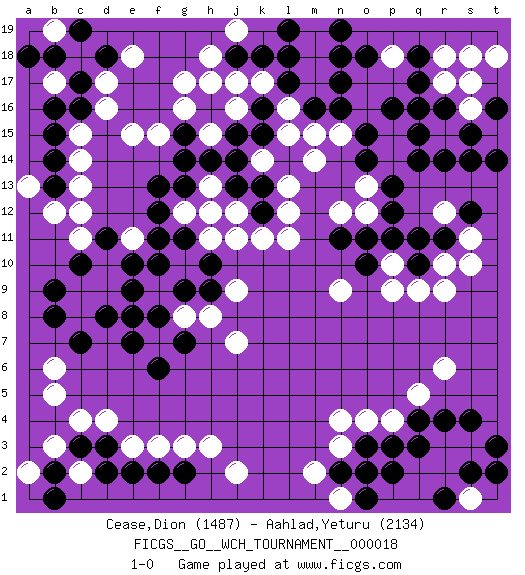 Last move : 1-0 2019 August 8 1:39:47 [Event "FICGS__GO__WCH_TOURNAMENT__000018"] [Site "FICGS"] [Date "2018.11.05"] [Round "1"] [Black "Cease,Dion"] [White "Aahlad,Yeturu"] [Result "1-0"] [Rating 1 "1487"] [Rating 2 "2134"] 1.q4 d16 2.q17 d4 3.q14 k17 4.c3 c4 5.d3 e3 6.e2 f3 7.f2 g3 8.g2 h3 9.c17 d17 10.c16 c15 11.b15 c14 12.b14 c13 13.b13 c12 14.k16 b3 15.b2 c18 16.b18 j16 17.l17 l16 18.k15 m17 19.l18 m18 20.k18 j17 21.m16 l15 22.l14 m15 23.n16 m14 24.j18 k14 25.j15 h15 26.j14 l13 27.h14 g17 28.n17 j12 29.g15 h17 30.h12 h11 31.j13 g12 32.k12 j11 33.k13 l11 34.g13 k11 35.f12 h13 36.g11 h12 37.f13 l12 38.h16 g16 39.f10 d10 40.g9 b17 41.b16 b19 42.a18 c2 43.d2 a2 44.b1 h8 45.e9 d9 46.e8 e11 47.f11 f7 48.h9 j9 49.f8 j7 50.h10 r6 51.r11 o4 52.o3 n3 53.p3 n4 54.s4 r15 55.r14 r17 56.q16 p18 57.o18 q5 58.r16 s16 59.s15 p4 60.r4 r9 61.q10 q9 62.o10 p10 63.p11 p9 64.n11 n9 65.n2 m2 66.o2 r10 67.q11 s11 68.s12 t15 69.s14 q2 70.q3 r18 71.q18 s18 72.t17 o12 73.o11 f15 74.e7 r2 75.s2 b12 76.c7 h15 77.g14 a13 78.d18 e18 79.c19 c8 80.b8 g8 81.e10 h18 82.f6 j2 83.d8 s3 84.t3 m19 85.n18 j19 86.n19 s1 87.t2 s17 88.t16 c9 89.b9 s10 90.d11 c11 91.c10 p15 92.o14 p14 93.p13 n15 94.o15 e15 95.l19 o13 96.q15 n1 97.p16 r3 98.p2 b6 99.g7 p1 100.r1 t18 101.t16 r12 102.t14 q1 103.o1 b5 104.r1 n12 105.p12 1-0 Here are the names of the openings (joseki) played in the four corners : Corner d4 : d4 c3 Hoshi (Hwajeom, Seongjeom, Xingwei`) 4-4 Point. The star or hoshi (4-4) point, emphasizing influence at the potential expense of territory. Corner d16 : d16 c17 Hoshi (Hwajeom, Seongjeom, Xingwei`) 4-4 Point. The star or hoshi (4-4) point, emphasizing influence at the potential expense of territory. Corner q4 : q4 r6 Hoshi (Hwajeom, Seongjeom, Xingwei`) 4-4 Point. The star or hoshi (4-4) point, emphasizing influence at the potential expense of territory. Ikken Kakari (Hankan Keolch'im, Yi Gua`jiao~, 1-Space Low Approach). White 2 is the standard approach move to the 4-4. Player Black won this Go (weiqi, baduk) game. Follow this game move after move (download)A knight's move near the edge of the board cannot be cut. (Bill Taylor) When you've done things right people won't know you've done anything at all. (Futurama)