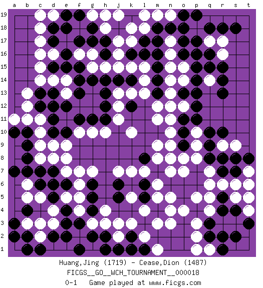 Last move : 0-1 2019 November 8 8:3:1 [Event "FICGS__GO__WCH_TOURNAMENT__000018"] [Site "FICGS"] [Date "2018.11.05"] [Round "1"] [Black "Huang,Jing"] [White "Cease,Dion"] [Result "0-1"] [Rating 1 "1719"] [Rating 2 "1487"] 1.q16 d4 2.r4 d16 3.f3 p3 4.c6 f4 5.g4 f5 6.e3 d3 7.d7 b5 8.e4 e5 9.d5 g3 10.g2 h3 11.h2 j3 12.d2 c2 13.e2 c5 14.d6 j2 15.b2 b3 16.c1 c3 17.g5 f6 18.g6 f7 19.f1 g7 20.j5 j7 21.j6 k7 22.l5 m3 23.l3 l2 24.b1 b6 25.b7 c8 26.b8 d8 27.c7 c10 28.b10 b11 29.b9 c11 30.a7 q5 31.r5 q6 32.m4 n3 33.m7 r6 34.q2 p2 35.q3 n5 36.l6 m9 37.n6 n8 38.l8 k10 39.o5 n4 40.p7 q4 41.s2 o7 42.o6 p8 43.q8 q7 44.p6 p9 45.k16 m5 46.f17 m6 47.r13 n7 48.f15 d14 49.d18 c17 50.k12 q17 51.p17 p18 52.q18 r17 53.r18 p16 54.o17 r16 55.q15 o18 56.s18 q14 57.r14 o15 58.p15 n17 59.o16 n16 60.p16 o14 61.r15 k18 62.m18 j16 63.l17 k17 64.n18 k15 65.l16 j15 66.h17 j17 67.h14 g16 68.h16 h15 69.g17 f16 70.e16 g15 71.e15 c18 72.d15 c15 73.d17 c16 74.f13 l15 75.d13 c14 76.h12 j13 77.h13 l13 78.f11 h10 79.g14 e14 80.f14 d19 81.e19 c19 82.e18 j12 83.p12 p5 84.q9 o4 85.q10 s6 86.t5 s5 87.s4 t6 88.s8 t4 89.t3 o12 90.o11 n11 91.o13 n12 92.p13 n13 93.o10 f10 94.g11 q1 95.r2 g10 96.d12 b13 97.p14 n15 98.j14 k13 99.h11 j11 100.e10 l18 101.m17 e9 102.d10 d9 103.t8 h18 104.g18 l4 105.h1 n10 106.o9 o8 107.h19 j19 108.j18 p10 109.p11 h18 110.m15 g19 111.f19 k3 112.m16 n14 113.m14 p1 114.m13 e13 115.e12 m12 116.j1 e8 117.k1 h19 118.l1 m1 119.d11 a11 120.a2 m19 121.p19 l19 122.a10 n19 123.o19 l7 124.c12 b12 125.r7 m8 126.s7 m11 127.r1 r9 128.r10 s9 129.r8 t5 130.b4 l14 131.o18 n9 132.k14 c9 133.a3 e7 134.k2 h4 135.c13 t7 136.e6 k5 137.pass pass 0-1 Here are the names of the openings (joseki) played in the four corners : Corner d4 : d4 f3 Hoshi (Hwajeom, Seongjeom, Xingwei`) 4-4 Point. The star or hoshi (4-4) point, emphasizing influence at the potential expense of territory. Ikken Kakari (Hankan Keolch'im, Yi Gua`jiao~, 1-Space Low Approach). Black 2 is the standard approach move to the 4-4. Corner q4 : r4 p3 Komoku (Somok, Xiao~mu`) 3-4 Point. The komoku (3-4) point is the traditional corner enclosure move.. Ikken Kakari (Hankan Keolch'im, Yi Gua`jiao~, 1-Space Low Pincer). The small knight move is the basic approach move to the 3-4 point stone. It has been continually used for over four centuries. There are limitless variations, with new moves constantly being discovered. White 2 opens the door to a treaure store of joseki. Player White won this Go (weiqi, baduk) game. Follow this game move after move (download)The second line is the line of defeat, the third line is the line of territory, and the fourth line is the line of influence. (Anonymous) He who defends everything defends nothing. (Frederick the Great)