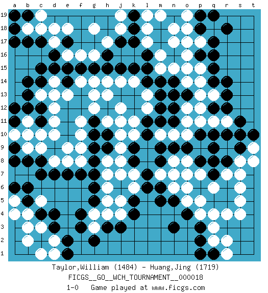 Last move : 1-0 2019 October 20 8:57:32 [Event "FICGS__GO__WCH_TOURNAMENT__000018"] [Site "FICGS"] [Date "2018.11.05"] [Round "1"] [Black "Taylor,William"] [White "Huang,Jing"] [Result "1-0"] [Rating 1 "1484"] [Rating 2 "1719"] 1.q16 d17 2.d3 q3 3.r5 c5 4.f4 c9 5.n3 p4 6.q7 r4 7.q5 s4 8.p2 o5 9.n5 n6 10.m5 o7 11.q10 o17 12.q14 k16 13.c15 c13 14.m6 g4 15.g5 h4 16.f3 h5 17.g6 j7 18.m8 q2 19.c7 c3 20.c2 b2 21.c4 b3 22.d4 b4 23.g8 j9 24.e15 f16 25.c11 b11 26.b10 c10 27.b12 d11 28.c12 d12 29.b13 b9 30.b6 d2 31.e2 c1 32.g10 f9 33.g9 a10 34.e10 d10 35.f15 g16 36.g15 e9 37.h16 h17 38.j17 j16 39.h15 g18 40.e17 e16 41.d16 e18 42.c17 d18 43.e7 f10 44.n7 o6 45.p3 q4 46.o4 p5 47.k8 j8 48.k5 j5 49.j3 j11 50.n16 n17 51.m17 m16 52.l16 m15 53.l15 l17 54.m18 l18 55.l14 n15 56.l11 l12 57.m12 k11 58.l10 g12 59.h12 h11 60.g11 h13 61.f12 g13 62.f13 l13 63.m14 k14 64.k15 j14 65.j15 j12 66.k17 n18 67.p18 o14 68.r13 r9 69.q9 r7 70.r8 s8 71.q8 s6 72.r6 s7 73.s9 s5 74.b5 d13 75.b14 c18 76.b17 o12 77.q1 r1 78.p1 r2 79.n14 o15 80.p16 o16 81.o13 p13 82.n13 p14 83.s11 p11 84.h3 k6 85.k4 t9 86.s10 p17 87.q17 q6 88.e1 d1 89.e11 f11 90.e12 f14 91.e14 e13 92.q12 p12 93.l6 q11 94.k9 k7 95.r12 b18 96.a18 q13 97.r14 o19 98.p19 r11 99.r10 g3 100.g2 j18 101.k18 m19 102.k19 j19 103.b8 d8 104.d7 h7 105.g7 n10 106.n11 o10 107.t10 t8 108.a8 a5 109.a6 a4 110.a12 p15 111.q15 d14 112.d15 f8 113.f7 h6 114.l7 n8 115.m9 g14 116.n9 m7 117.o9 p7 118.n7 q18 119.r18 m7 120.p10 o11 121.n7 o18 122.q19 m7 123.p8 n7 124.b19 c19 125.a17 h14 126.a19 m10 127.m11 k10 128.h10 j10 129.c8 e8 130.a11 b10 131.c14 o8 132.n12 l19 133.a9 h8 134.h9 j4 135.m13 1-0 Here are the names of the openings (joseki) played in the four corners : Corner q4 : q3 r5 Komoku (Somok, Xiao~mu`) 3-4 Point. The komoku (3-4) point is the traditional corner enclosure move.. Ikken Kakari (Hankan Keolch'im, Yi Gua`jiao~, 1-Space Low Pincer). The small knight move is the basic approach move to the 3-4 point stone. It has been continually used for over four centuries. There are limitless variations, with new moves constantly being discovered. Black 2 opens the door to a treaure store of joseki. Corner d4 : d3 c5 Komoku (Somok, Xiao~mu`) 3-4 Point. The komoku (3-4) point is the traditional corner enclosure move.. Ikken Kakari (Hankan Keolch'im, Yi Gua`jiao~, 1-Space Low Pincer). The small knight move is the basic approach move to the 3-4 point stone. It has been continually used for over four centuries. There are limitless variations, with new moves constantly being discovered. White 2 opens the door to a treaure store of joseki. Corner q16 : q16 o17 Hoshi (Hwajeom, Seongjeom, Xingwei`) 4-4 Point. The star or hoshi (4-4) point, emphasizing influence at the potential expense of territory. Ikken Kakari (Hankan Keolch'im, Yi Gua`jiao~, 1-Space Low Approach). White 2 is the standard approach move to the 4-4. Corner d16 : d17 c15 Komoku (Somok, Xiao~mu`) 3-4 Point. The komoku (3-4) point is the traditional corner enclosure move.. Ikken Kakari (Hankan Keolch'im, Yi Gua`jiao~, 1-Space Low Pincer). The small knight move is the basic approach move to the 3-4 point stone. It has been continually used for over four centuries. There are limitless variations, with new moves constantly being discovered. Black 2 opens the door to a treaure store of joseki. Player Black won this Go (weiqi, baduk) game. Follow this game move after move (download)One point in the center is worth ten in the corner. (Anonymous) Is not life a hundred times too short to bore ourselves ? (Friedrich Nietzsche)