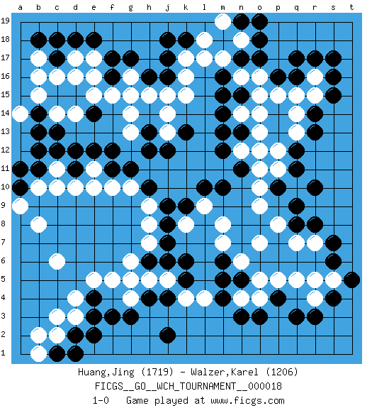Last move : 1-0 2019 June 7 13:20:43 [Event "FICGS__GO__WCH_TOURNAMENT__000018"] [Site "FICGS"] [Date "2018.11.05"] [Round "1"] [Black "Huang,Jing"] [White "Walzer,Karel"] [Result "1-0"] [Rating 1 "1719"] [Rating 2 "1206"] 1.q17 d4 2.q3 d16 3.f3 c6 4.j4 g4 5.g3 q5 6.q8 r4 7.r3 o5 8.n3 l4 9.n5 r7 10.r8 n6 11.m5 o7 12.q11 q15 13.r13 o16 14.o17 r16 15.r17 n16 16.n17 m17 17.m16 l17 18.m15 o13 19.m12 n12 20.m13 o10 21.j17 k16 22.f17 c14 23.j16 k15 24.k13 j14 25.h12 g14 26.d18 d10 27.k6 j5 28.k5 h5 29.h4 f5 30.d2 c3 31.c17 c16 32.m10 o9 33.s7 q7 34.s6 h9 35.h10 g10 36.j9 h8 37.g11 f10 38.e12 f15 39.c12 c11 40.c13 b17 41.b18 b16 42.b14 d14 43.b11 b10 44.d11 c10 45.b12 e11 46.d12 n18 47.o18 l18 48.k18 m19 49.s17 b15 50.j8 c2 51.e3 d3 52.e2 k4 53.j2 m8 54.m6 m7 55.s4 q13 56.r14 q14 57.s15 q10 58.r10 p11 59.q12 p12 60.q9 p8 61.a10 a9 62.a11 b8 63.h6 g6 64.j6 g5 65.s16 a14 66.b13 k8 67.k9 g13 68.f11 e10 69.f12 g16 70.g17 d17 71.c18 j13 72.j12 e17 73.e18 o4 74.o3 n4 75.m4 s5 76.t5 r5 77.p10 l9 78.l10 n14 79.m14 k17 80.j18 h15 81.f16 e16 82.p16 p15 83.n15 o15 84.n11 o11 85.n13 o14 86.p4 p5 87.c1 b1 88.d1 b2 89.q16 r15 90.o19 h7 91.j7 o12 92.e4 e5 93.h16 g15 94.e14 e15 95.h13 j15 96.n19 1-0 Here are the names of the openings (joseki) played in the four corners : Corner d4 : d4 f3 Hoshi (Hwajeom, Seongjeom, Xingwei`) 4-4 Point. The star or hoshi (4-4) point, emphasizing influence at the potential expense of territory. Ikken Kakari (Hankan Keolch'im, Yi Gua`jiao~, 1-Space Low Approach). Black 2 is the standard approach move to the 4-4. Corner q4 : q3 q5 Komoku (Somok, Xiao~mu`) 3-4 Point. The komoku (3-4) point is the traditional corner enclosure move.. Ikken Takagakari (Hankan Nop'dakeolch'im, Yi Gaogua`jiao~, 1-Space High Approach). The 5-4 approach move has become more popular in modern times, as modern Go emphasizes speed and influence. Corner d16 : d16 j17 Hoshi (Hwajeom, Seongjeom, Xingwei`) 4-4 Point. The star or hoshi (4-4) point, emphasizing influence at the potential expense of territory. Player Black won this Go (weiqi, baduk) game. Follow this game move after move (download)With only one group, you will win. (Anonymous) Somehow our devils are never quite what we expect when we meet them face to face. (Nelson DeMille)