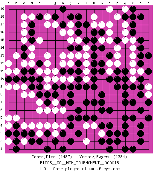 Last move : 1-0 2019 September 5 3:28:24 [Event "FICGS__GO__WCH_TOURNAMENT__000018"] [Site "FICGS"] [Date "2018.11.05"] [Round "1"] [Black "Cease,Dion"] [White "Yarkov,Evgeny"] [Result "1-0"] [Rating 1 "1487"] [Rating 2 "1384"] 1.q4 q16 2.d16 d4 3.c3 c4 4.d3 e3 5.e2 f2 6.f3 e4 7.g2 f4 8.f1 g3 9.h3 f2 10.r17 q17 11.r16 r15 12.s15 r14 13.s14 r13 14.f3 g4 15.j2 d10 16.c13 f17 17.s13 r12 18.k16 c17 19.d17 c16 20.d15 c15 21.d11 e11 22.c10 d14 23.c14 d13 24.c11 d18 25.e18 c18 26.e12 e15 27.j5 c8 28.n16 r18 29.s18 p18 30.r19 r3 31.q3 r4 32.r5 s5 33.s6 r6 34.q5 s7 35.s4 t6 36.s3 q6 37.p15 q19 38.q18 m17 39.p19 r2 40.s2 q2 41.p2 p5 42.o4 o5 43.n4 n5 44.m16 m4 45.n2 b3 46.b2 c2 47.d2 a2 48.b1 d12 49.e10 f11 50.d9 j17 51.k17 j16 52.j18 h18 53.k18 k15 54.l15 q15 55.g18 g17 56.h19 o12 57.h17 h16 58.k14 j15 59.j14 d8 60.e8 e7 61.f8 f13 62.f7 e6 63.m5 m6 64.l5 l14 65.m14 l13 66.m13 l12 67.m12 l11 68.m11 l10 69.m10 c12 70.b12 b13 71.l9 j10 72.k9 o9 73.k10 j12 74.j11 h13 75.h11 l6 76.k6 p1 77.p3 p4 78.o2 n3 79.o3 l4 80.k5 h4 81.j4 h12 82.r1 l16 83.l17 f10 84.k12 k13 85.k11 j13 86.s12 s11 87.s10 r11 88.t11 b11 89.b10 a12 90.b4 b5 91.a3 h6 92.h7 c9 93.a10 h8 94.j7 g7 95.g8 g6 96.g9 g10 97.h9 o17 98.r9 r10 99.s8 t12 100.t13 t8 101.q8 b9 102.q9 t9 103.s9 o7 104.p11 p10 105.q10 o11 106.q11 p14 107.m7 n9 108.n7 m18 109.m9 p7 110.p9 n10 111.o10 n15 112.m15 p12 113.n6 p8 114.o6 p6 115.n11 l2 116.n8 o8 117.p10 o16 118.r7 h10 119.j9 f18 120.q7 a9 121.s6 f9 122.e9 f12 123.t5 o19 124.t7 q19 125.r18 a11 126.d10 a5 127.q1 a4 128.b3 g11 129.o1 f6 130.l7 n13 131.n14 o15 132.o13 p13 133.n12 n17 134.j8 j3 135.k3 h2 136.h1 1-0 Here are the names of the openings (joseki) played in the four corners : Corner d4 : d4 c3 Hoshi (Hwajeom, Seongjeom, Xingwei`) 4-4 Point. The star or hoshi (4-4) point, emphasizing influence at the potential expense of territory. Corner q16 : q16 r17 Hoshi (Hwajeom, Seongjeom, Xingwei`) 4-4 Point. The star or hoshi (4-4) point, emphasizing influence at the potential expense of territory. Corner q4 : q4 r3 Hoshi (Hwajeom, Seongjeom, Xingwei`) 4-4 Point. The star or hoshi (4-4) point, emphasizing influence at the potential expense of territory. Player Black won this Go (weiqi, baduk) game. Follow this game move after move (download)You don't have to be really good anymore to get good results. What's happening with chess is that it's gradually losing its place as the par excellence of intellectual activity. Smart people in search of a challenging board game might try a game called Go. (Hans Berliner, The New York Times, 2003) I've lost money so fast in these clubs it's left me reeling. I've read every poker book ever written, but the only way to get better at the game is to go out and play with people who are really good. The problem is, you stand to lose a lot of money doing it. (Matt Damon)