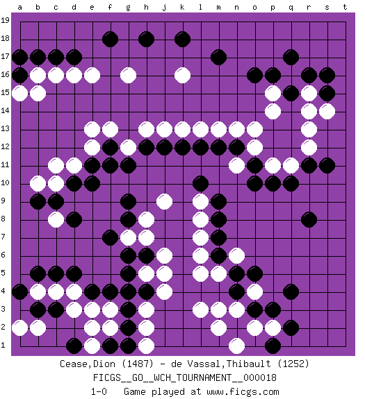 Last move : 1-0 2018 December 30 19:54:35 [Event "FICGS__GO__WCH_TOURNAMENT__000018"] [Site "FICGS"] [Date "2018.11.05"] [Round "1"] [Black "Cease,Dion"] [White "de Vassal,Thibault"] [Result "1-0"] [Rating 1 "1487"] [Rating 2 "1252"] 1.q4 d16 2.q17 d3 3.c5 c8 4.e4 e3 5.f4 d4 6.d5 f3 7.g4 l3 8.g3 c4 9.o3 c11 10.c17 c16 11.d17 e16 12.f18 r15 13.d10 c10 14.d8 l5 15.c9 d11 16.b5 b4 17.b9 b10 18.o16 g16 19.e10 l7 20.e11 e12 21.f12 e13 22.r11 r13 23.r16 p14 24.r8 q11 25.q10 p11 26.p10 r12 27.s11 n6 28.o11 o12 29.n12 n11 30.o10 o13 31.s15 n13 32.m12 m13 33.l12 l13 34.k12 f13 35.m6 l6 36.m7 m5 37.m8 n3 38.n4 o4 39.n2 m3 40.o5 o2 41.p3 p2 42.q2 m2 43.n5 l8 44.m9 h7 45.b17 b16 46.a16 a15 47.a17 b15 48.h18 g12 49.f11 j13 50.j12 k13 51.h12 h13 52.g11 k16 53.m17 l9 54.l10 j9 55.p1 n1 56.q15 r14 57.k18 p15 58.p16 s14 59.s16 h5 60.g6 g7 61.f7 h2 62.g2 f2 63.f1 e1 64.g1 h3 65.h4 j4 66.h6 j6 67.g5 j5 68.g8 h8 69.g9 h1 70.d1 e2 71.b3 b2 72.a4 a2 73.c3 1-0 Here are the names of the openings (joseki) played in the four corners : Corner d4 : d3 c5 Komoku (Somok, Xiao~mu`) 3-4 Point. The komoku (3-4) point is the traditional corner enclosure move.. Ikken Kakari (Hankan Keolch'im, Yi Gua`jiao~, 1-Space Low Pincer). The small knight move is the basic approach move to the 3-4 point stone. It has been continually used for over four centuries. There are limitless variations, with new moves constantly being discovered. Black 2 opens the door to a treaure store of joseki. Corner q4 : q4 l3 Hoshi (Hwajeom, Seongjeom, Xingwei`) 4-4 Point. The star or hoshi (4-4) point, emphasizing influence at the potential expense of territory. Corner q16 : q17 r15 Komoku (Somok, Xiao~mu`) 3-4 Point. The komoku (3-4) point is the traditional corner enclosure move.. Ikken Kakari (Hankan Keolch'im, Yi Gua`jiao~, 1-Space Low Pincer). The small knight move is the basic approach move to the 3-4 point stone. It has been continually used for over four centuries. There are limitless variations, with new moves constantly being discovered. White 2 opens the door to a treaure store of joseki. Player Black won this Go (weiqi, baduk) game. Follow this game move after move (download)There are players who don't accept exchange: they play many moves that perpetuate a previous state of the game. (Pierre Audouard) First of all, we have to go back to the classical time control. (Anatoly Karpov)