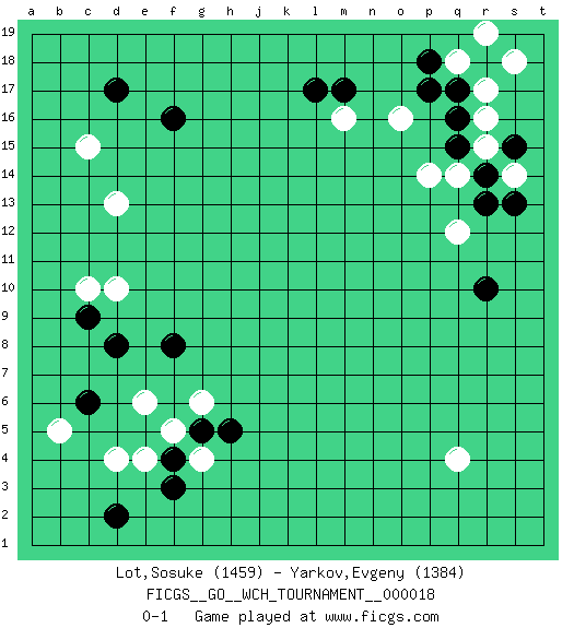 Last move : 0-1 2019 January 19 18:39:5 [Event "FICGS__GO__WCH_TOURNAMENT__000018 "] [Site "FICGS"] [Date "2018.11.05"] [Round "1"] [Black "Lot,Sosuke "] [White "Yarkov,Evgeny "] [Result "0-1"] [Rating 1 "1459"] [Rating 2 "1384"] 1.q16 q4 2.d17 d4 3.c6 e6 4.d8 c10 5.c9 d10 6.f8 c15 7.f16 r17 8.q17 r16 9.r14 r15 10.q15 q18 11.p18 s14 12.r18 s18 13.s15 r19 14.s13 q14 15.r13 o16 16.p17 p14 17.m17 m16 18.l17 q12 19.r10 d13 20.f3 b5 21.d2 g4 22.f4 f5 23.g5 g6 24.h5 e4 0-1 This go game has been lost on time (started : 2018.11.05 21:29:39) Here are the names of the openings (joseki) played in the four corners : Corner d4 : d4 c6Hoshi (Hwajeom, Seongjeom, Xingwei`) 4-4 Point. The star or hoshi (4-4) point, emphasizing influence at the potential expense of territory.Ikken Kakari (Hankan Keolch'im, Yi Gua`jiao~, 1-Space Low Approach). Black 2 is the standard approach move to the 4-4. Corner d16 : d17 c15Komoku (Somok, Xiao~mu`) 3-4 Point. The komoku (3-4) point is the traditional corner enclosure move..Ikken Kakari (Hankan Keolch'im, Yi Gua`jiao~, 1-Space Low Pincer). The small knight move is the basic approach move to the 3-4 point stone. It has been continually used for over four centuries. There are limitless variations, with new moves constantly being discovered. White 2 opens the door to a treaure store of joseki. Corner q16 : q16 r17Hoshi (Hwajeom, Seongjeom, Xingwei`) 4-4 Point. The star or hoshi (4-4) point, emphasizing influence at the potential expense of territory. Player White won this Go (weiqi, baduk) game.Follow this game move after move (download ) Five groups might live but the six will die. (Anonymous) Fame, I have already. Now I need the money. (an elderly Steinitz)