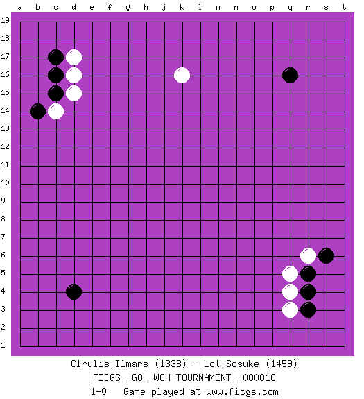 Last move : 1-0 2019 January 17 6:4:0 [Event "FICGS__GO__WCH_TOURNAMENT__000018"] [Site "FICGS"] [Date "2018.11.05"] [Round "1"] [Black "Cirulis,Ilmars"] [White "Lot,Sosuke"] [Result "1-0"] [Rating 1 "1338"] [Rating 2 "1459"] 1.q16 d16 2.d4 q4 3.c17 d17 4.c16 d15 5.c15 c14 6.b14 k16 7.r3 q3 8.r4 r6 9.r5 q5 10.s6 1-0 This go game has been lost on time (started : 2018.11.05 21:29:39) Here are the names of the openings (joseki) played in the four corners : Corner d16 : d16 c17 Hoshi (Hwajeom, Seongjeom, Xingwei`) 4-4 Point. The star or hoshi (4-4) point, emphasizing influence at the potential expense of territory. Corner q4 : q4 r3 Hoshi (Hwajeom, Seongjeom, Xingwei`) 4-4 Point. The star or hoshi (4-4) point, emphasizing influence at the potential expense of territory. Player Black won this Go (weiqi, baduk) game. Follow this game move after move (download)Never try to cut bamboo joints. (Anonymous) The Internet is the first thing that humanity has build that humanity doesn't understand, the largest experiment in anarchy that we have ever had. (Eric Schmidt)