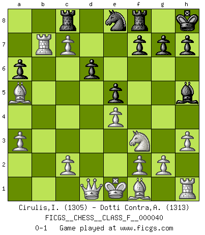 Last move : 0-1 2007 September 3 6:57:31 [Event "FICGS__CHESS__CLASS_F__000040"] [Site "FICGS"] [Date "2007.05.23"] [Round "1"] [White "Cirulis,Ilmars"] [Black "Dotti Contra,Alessandro"] [Result "0-1"] [WhiteElo "1305"] [BlackElo "1313"] 1.Nc3 e5 2.Nf3 Nc6 3.d4 d6 4.d5 Na5 5.a3 Be7 6.e4 Nf6 7.b4 c6 8.bxa5 Qxa5 9.Bd2 Bg4 10.Rb1 Rb8 11.dxc6 O-O 12.Nd5 Qd8 13.c7 Qc8 14.Nxe7+ Kh8 15.Nxc8 Rbxc8 16.Rxb7 Ne8 17.Ba5 a6 18.h3 Bh5 0-1 This chess game has been lost on time (started : 2007.05.23 23:11:20) Dunst (Sleipner-Heinrichsen) Opening Kingside Castling by player Black (move 11) Player Black won this chess game. Follow this game move after move (download)That's what Chess is all about. One day you give your opponent a lesson, the next day he gives you one. (Bobby Fischer) Karpov ist ein Museumsstück. (Garry Kasparov) El Ajedrez no es una pizca de inferior al violín, y tenemos un gran número de violinistas profesionales. (Mikhail Botvinnik) Mon pion favori sur ma case favorite ! Bronstein en parlant d'un coup de pion en h5 quand il avait les Noirs. I find your interest interesting. (Gregory House, House M.D.)