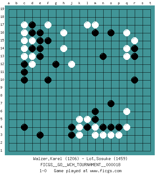 Last move : 1-0 2019 February 4 19:24:17 [Event "FICGS__GO__WCH_TOURNAMENT__000018"] [Site "FICGS"] [Date "2018.11.05"] [Round "1"] [Black "Walzer,Karel"] [White "Lot,Sosuke"] [Result "1-0"] [Rating 1 "1206"] [Rating 2 "1459"] 1.c4 q4 2.d16 q16 3.e3 c14 4.c12 c17 5.d17 c16 6.d14 d15 7.e15 c15 8.f15 d13 9.e14 c13 10.c10 f17 11.e16 h16 12.e13 d12 13.c11 h14 14.g12 j12 15.f10 n3 16.p4 p3 17.o4 o3 18.n4 m4 19.o7 q6 20.m5 l5 21.l4 m3 22.m6 k5 23.j3 k3 24.j4 k4 25.o16 m17 26.r14 q14 27.r13 r15 28.r10 q13 29.m16 l17 30.n13 1-0 This go game has been lost on time (started : 2018.11.05 21:29:39) Here are the names of the openings (joseki) played in the four corners : Corner d16 : d16 c14 Hoshi (Hwajeom, Seongjeom, Xingwei`) 4-4 Point. The star or hoshi (4-4) point, emphasizing influence at the potential expense of territory. Ikken Kakari (Hankan Keolch'im, Yi Gua`jiao~, 1-Space Low Approach). White 2 is the standard approach move to the 4-4. Corner q16 : q16 o16 Hoshi (Hwajeom, Seongjeom, Xingwei`) 4-4 Point. The star or hoshi (4-4) point, emphasizing influence at the potential expense of territory. Ikken Takagakari (Hankan Nop'dakeolch'im, Yi Gaojia, 1-Space High Approach). White typically responds at 6-4 or 3-10. White 4-10 is played when White finds play on the right side advantageous. White 4-8 or 3-8 may be played when White has support at top. Player Black won this Go (weiqi, baduk) game. Follow this game move after move (download)Strike at the waist of the knight's move. (Anonymous) Wipe them out. All of them. (Darth Sidious in Star Wars ep.1)