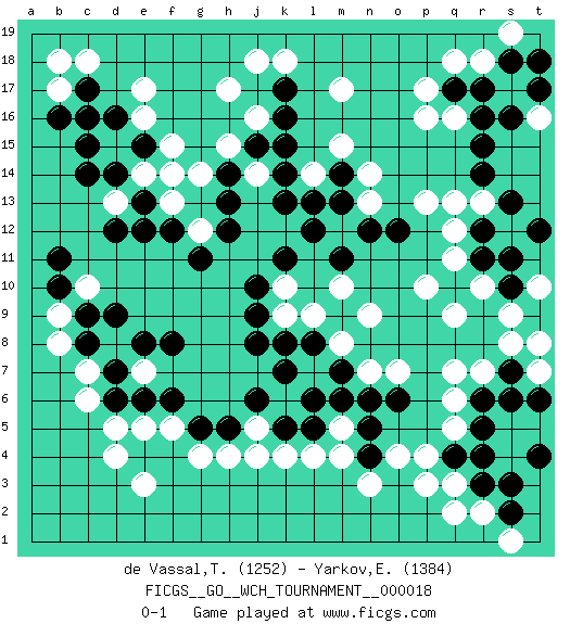 Last move : 0-1 2019 February 17 19:41:55 [Event "FICGS__GO__WCH_TOURNAMENT__000018"] [Site "FICGS"] [Date "2018.11.05"] [Round "1"] [Black "de Vassal,Thibault"] [White "Yarkov,Evgeny"] [Result "0-1"] [Rating 1 "1252"] [Rating 2 "1384"] 1.q4 d4 2.q17 e17 3.r15 o4 4.r6 q3 5.r3 p3 6.k17 r2 7.s3 h17 8.c16 d15 9.c15 d13 10.d16 e16 11.d14 e14 12.c14 m17 13.k15 p17 14.e15 q16 15.r16 q18 16.r17 f15 17.e13 f14 18.d12 f13 19.e12 m15 20.k13 r18 21.r12 c6 22.c8 k4 23.o6 q11 24.o12 q12 25.r11 p13 26.q10 p10 27.k11 r13 28.s13 s12 29.r14 r10 30.s11 q9 31.s10 j14 32.k14 m10 33.f12 c18 34.f8 g4 35.j8 k9 36.j9 g12 37.g11 d8 38.d7 c7 39.d9 b8 40.c9 m12 41.h12 q5 42.r5 q6 43.k8 l7 44.l8 m8 45.k7 q7 46.m9 n9 47.m7 l9 48.l6 r7 49.s2 q2 50.s7 s8 51.s6 e7 52.e8 m5 53.m6 j16 54.k16 e3 55.l5 l4 56.d6 d5 57.e6 b9 58.b10 c10 59.b11 j18 60.m14 n14 61.m13 n13 62.l12 l14 63.l13 t7 64.t9 s9 65.h5 h4 66.g5 p4 67.r4 s1 68.t6 t8 69.t4 f5 70.f6 k18 71.m11 q13 72.n12 p16 73.s18 s19 74.t18 s17 75.t17 t10 76.t12 j5 77.j6 n7 78.n6 b17 79.b16 k10 80.j10 e5 81.k5 o7 82.n5 m4 83.n4 n3 84.c17 b18 85.j15 h15 86.h14 g14 87.h13 t16 88.s16 j4 0-1 Here are the names of the openings (joseki) played in the four corners : Corner q4 : q4 o4 Hoshi (Hwajeom, Seongjeom, Xingwei`) 4-4 Point. The star or hoshi (4-4) point, emphasizing influence at the potential expense of territory. Ikken Takagakari (Hankan Nop'dakeolch'im, Yi Gaojia, 1-Space High Approach). Black typically responds at 6-4 or 3-10. Black 4-10 is played when Black finds play on the right side advantageous. Black 4-8 or 3-8 may be played when Black has support at top. Player White won this Go (weiqi, baduk) game. Follow this game move after move (download)If a formation is symmetrical, play at the center. (Anonymous) A cynic is a man who knows the price of everything but the value of nothing. (Oscar Wilde)