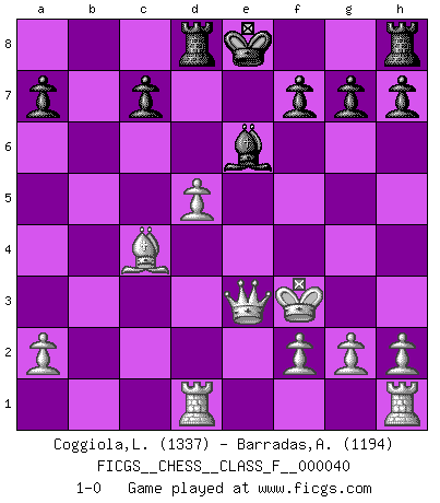 Last move : 1-0 2007 June 19 19:27:54 [Event "FICGS__CHESS__CLASS_F__000040"] [Site "FICGS"] [Date "2007.05.23"] [Round "1"] [White "Coggiola,Leandro Damian"] [Black "Barradas,Anderson"] [Result "1-0"] [WhiteElo "1337"] [BlackElo "1194"] 1.e4 e5 2.Nf3 Nf6 3.Nc3 d5 4.Nxe5 Be6 5.exd5 Nxd5 6.Nxd5 Qxd5 7.d4 Nc6 8.Nxc6 bxc6 9.Be3 Bd6 10.c4 Bb4+ 11.Bd2 Bxd2+ 12.Qxd2 Qe4+ 13.Qe3 Qc2 14.d5 cxd5 15.cxd5 Qxb2 16.Rd1 Qb4+ 17.Ke2 Qc4+ 18.Kf3 Rd8 19.Bxc4 1-0 Petrov Three knights game Player White won this chess game. Follow this game move after move (download)If your opponent cannot do anything active, then don't rush the position; instead you should let him sit there, suffer, and beg you for a draw. (Jeremy Silman) Meine Liebe ist Schach, Schach, Schach. Ich muss jeden Tag Schach spielen, deshalb fühle ich mich so stark. (Miguel Najdorf) Debemos de asegurarnos de que el Ajedrez no se convierta en un lenguaje muerto, muy interesante, pero solo para un grupo muy pequeño. (Sytze Faber) Les échecs sont utiles à l'exercice de la faculté de penser et à celle de l'imagination. Car nous devons posséder une méthode élaborée pour atteindre des buts partout où nous devons conduire notre raison. (Leibnitz) Big Chess is a place for big hallucinations. (Thibault de Vassal)