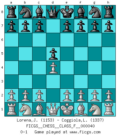 Last move : 0-1 2007 July 5 9:53:51 [Event "FICGS__CHESS__CLASS_F__000040"] [Site "FICGS"] [Date "2007.05.23"] [Round "1"] [White "Lorena,June"] [Black "Coggiola,Leandro Damian"] [Result "0-1"] [WhiteElo "1153"] [BlackElo "1337"] 1.d4 d5 0-1 This chess game has been lost on time (started : 2007.05.23 23:11:20) Queen's pawn game Player Black won this chess game. Follow this game move after move (download)If cunning alone were needed to excel, women would be the best Chess players. (Albin) Fischer: 'Remis!?' Uhlmann: 'Aber es muss doch dreimal Zugwiederholung sein!' Fischer: 'Sie nehmen das Remis an, wie ich es sage, sonst spiele ich weiter und werde Sie dann schlagen!' (Robert James Fischer) Bobby Fischer es el mas grande genio de Ajedrez de todos los tiempos. (Alexander Kotov) Avant la finale, les dieux ont créé le milieu de partie. (Tarrasch) Always two there are. No more no less. A master, and an apprentice. (Master Yoda in Star Wars ep.1)