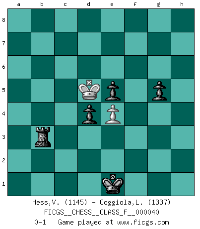 Last move : 0-1 2007 September 7 19:20:42 [Event "FICGS__CHESS__CLASS_F__000040"] [Site "FICGS"] [Date "2007.05.23"] [Round "1"] [White "Hess,Volker"] [Black "Coggiola,Leandro Damian"] [Result "0-1"] [WhiteElo "1145"] [BlackElo "1337"] 1.c4 c5 2.Nc3 g6 3.g3 Bg7 4.Bg2 Nf6 5.Nf3 d5 6.cxd5 Nxd5 7.Nxd5 Qxd5 8.O-O O-O 9.d3 Nc6 10.Qc2 Bd7 11.Nd2 Qd6 12.Ne4 Qe5 13.Bf4 Qxb2 14.Qxb2 Bxb2 15.Rab1 Bd4 16.Rxb7 Be6 17.Rc7 Nb4 18.a3 Nd5 19.Ng5 Nxc7 20.Bxc7 Rac8 21.Nxe6 fxe6 22.Bf4 Kf7 23.Rb1 e5 24.Bg5 Rb8 25.Rc1 Rfc8 26.Bd5+ e6 27.Bc4 Rc7 28.Kg2 Rcb7 29.a4 Rb1 30.Bb5 Rxc1 31.Bxc1 Rb6 32.Bd2 Kf6 33.h4 Kf5 34.e4+ Kf6 35.Bg5+ Kf7 36.Kf3 a6 37.Bc4 Rb2 38.Be3 Bxe3 39.Kxe3 Rb4 40.Bxa6 Rxa4 41.Bc4 Kf6 42.g4 Ra1 43.g5+ Ke7 44.Kf3 Kd6 45.Kg2 Ra3 46.Kf3 Ra1 47.Kg2 Rd1 48.Kh2 Kc6 49.Kg2 Kb6 50.Kf3 Ka5 51.Kg2 Kb4 52.Kf3 Kc3 53.Ke2 Rh1 54.Bxe6 Rxh4 55.Bg8 Rh2 56.Ke3 Kc2 57.Bc4 Rh5 58.Bg8 Rxg5 59.Bxh7 Kc3 60.Bg8 Rh5 61.Bf7 Rh3+ 62.f3 g5 63.Be6 Rh2 64.Bc4 Kc2 65.Be6 Kd1 66.Bb3+ Ke1 67.d4 cxd4+ 68.Kd3 Rf2 69.Kc4 Rxf3 70.Kd5 Rxb3 0-1 English : Symmetrical variation Kingside Castling by player White (move 8) Kingside Castling by player Black (move 8) 10 pieces endgame at move 59 : White KBPPP , Black KRPPP WHITE : King + 1 Bishop 3 Pawns BLACK : King + 1 Rook 3 Pawns 9 pieces endgame at move 67 : White KBPP , Black KRPPP WHITE : King + 1 Bishop 2 Pawns BLACK : King + 1 Rook 3 Pawns 8 pieces endgame at move 69 : White KBP , Black KRPPP WHITE : King + 1 Bishop 1 Pawn BLACK : King + 1 Rook 3 Pawns 7 pieces endgame at move 70 : White KP , Black KRPPP WHITE : King + 1 Pawn BLACK : King + 1 Rook 3 Pawns Player Black won this chess game. Follow this game move after move (download)Only the player with the initiative has the right to attack. (Wilhelm Steinitz) Schach verlangt totale Konzentration. (Robert James Fischer) En un gambito tu regalas un Peón por el bién de tomar un juego perdido. (Samuel Standige Boden) Votre seul travail dans les ouvertures est d'obtenir un milieu de partie jouable. (Lajos Portish) Some people are so afraid to die that they never begin to live. (Henry Van Dyke)