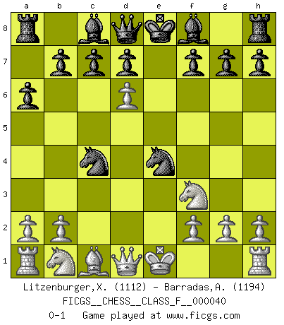 Last move : 0-1 2007 July 6 10:0:15 [Event "FICGS__CHESS__CLASS_F__000040"] [Site "FICGS"] [Date "2007.05.23"] [Round "1"] [White "Litzenburger,Xavier"] [Black "Barradas,Anderson"] [Result "0-1"] [WhiteElo "1112"] [BlackElo "1194"] 1.e4 e5 2.Nf3 Nc6 3.Bc4 Nf6 4.c3 a6 5.d4 exd4 6.cxd4 Nxe4 7.d5 Na5 8.d6 Nxc4 0-1 This chess game has been lost on time (started : 2007.05.23 23:11:20) Two knights defense Player Black won this chess game. Follow this game move after move (download)Capture of the adverse King is the ultimate but not the first object of the game. (William Steinitz) Die Fehler sind da, Sie warten nur darauf gemacht zu werden. (Savielly Grigorievitsch Tartakower) Todos los jugadores de Ajedrez deberían tener un pasatiempo. (Savielly Tartakower) C'est la seule position que je connaisse où les deux camps sont mals. Propos prêtés à V. Anand. Success without honor is an unseasoned dish; it will satisfy your hunger, but it won't taste good. (Joe Paterno)