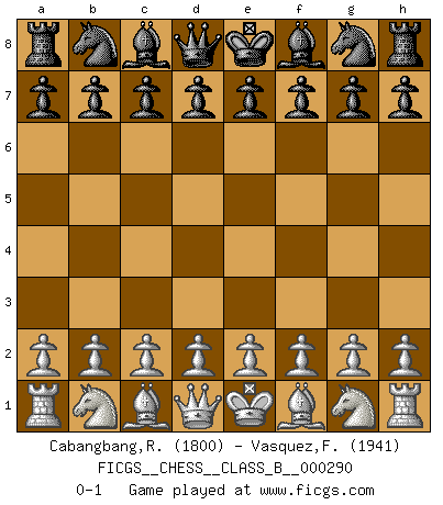 Last move : 0-1 2018 December 18 2:6:30 [Event "FICGS__CHESS__CLASS_B__000290"] [Site "FICGS"] [Date "2018.11.07"] [Round "1"] [White "Cabangbang,Richard"] [Black "Vasquez,Fernando"] [Result "0-1"] [WhiteElo "1800"] [BlackElo "1941"] 0-1 This chess game has been lost on time (started : 2018.11.07 19:38:46) Player Black won this chess game. Follow this game move after move (download)Pawns are born free, yet they are everywhere in chains. (Rick Kennedy) Das typische an einem Großmeister ist, daß er eine gewonnene Position schnell und schmerzlos gewinnt. (Irving Chernev) No es una movida, aún la mejor movida que tu debas buscar, sino un plan comprensible. (Eugene Znosko-Borovsky) Nous sommes les pions de la mystérieuse partie d'Echecs jouée par Dieu. Il nous déplace, nous arrête, nous pousse encore, puis nous lance un à un dans la boîte du Néant. Epitaphe sur la tombe de David Janowsky (1868-1927). But they are useless. They can only give you answers. (Pablo Picasso, about computers)