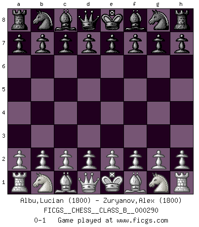 Last move : 0-1 2018 December 18 2:6:30 [Event "FICGS__CHESS__CLASS_B__000290"] [Site "FICGS"] [Date "2018.11.07"] [Round "1"] [White "Albu,Lucian"] [Black "Zuryanov,Alex"] [Result "0-1"] [WhiteElo "1800"] [BlackElo "1800"] 0-1 This chess game has been lost on time (started : 2018.11.07 19:38:46) Player Black won this chess game. Follow this game move after move (download)Pawns are born free, yet they are everywhere in chains. (Rick Kennedy) Herr Iljumschinow ist ein etwas merkwürdiger Geschäftsmann: Er arbeitet zusammen mit Leuten wie Muammar al-Gaddafi; früher ist das Saddam Hussein gewesen. (Joel Lautier) El Ajedrez por encima de todo... ¡es una pelea!. (Emanuel Lasker) Aidez vos pièces, elles vous aideront. (Paul Morphy) We cannot be sure of having something to live for unless we are willing to die for it. (Ernesto Che Guevara)
