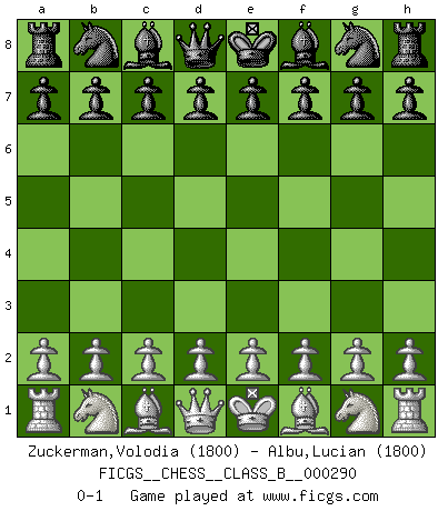 Last move : 0-1 2018 December 18 2:6:30 [Event "FICGS__CHESS__CLASS_B__000290"] [Site "FICGS"] [Date "2018.11.07"] [Round "1"] [White "Zuckerman,Volodia"] [Black "Albu,Lucian"] [Result "0-1"] [WhiteElo "1800"] [BlackElo "1800"] 0-1 This chess game has been lost on time (started : 2018.11.07 19:38:46) Player Black won this chess game. Follow this game move after move (download)He who fears an isolated Queen's Pawn should give up Chess. (Siegbert Tarrasch) Das Zentrum ist der Balkan des Schachbretts - Kriegshandlungen können in jedem Moment ausbrechen. (Aaron Nimzowitsch) El Ajedrez es un expediente tonto que hace creer a la gente inactiva que hacen una cosa muy astuta cuando solamente estan perdiendo su tiempo. (George Bernard Shaw) Le moment que je préfère le plus dans une rencontre, c'est celui où je sens que la personnalité de l'adversaire se brise. (Robert Fischer) The only difference between a tax man and a taxidermist is that the taxidermist leaves the skin. (Mark Twain)