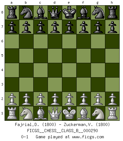 Last move : 0-1 2018 December 18 2:6:30 [Event "FICGS__CHESS__CLASS_B__000290"] [Site "FICGS"] [Date "2018.11.07"] [Round "1"] [White "Fajrial,Damoel"] [Black "Zuckerman,Volodia"] [Result "0-1"] [WhiteElo "1800"] [BlackElo "1800"] 0-1 This chess game has been lost on time (started : 2018.11.07 19:38:46) Player Black won this chess game. Follow this game move after move (download)Chess is a terrific way for kids to build self image and self esteem. (Saudin Robovic) Wer mein Gambit spielt, muß bereit sein, alle Brücken hinter sich abzubrechen. Es verändert den ganzen Menschen. Es wirkt wie ein Zauberstab und fördert verkümmerte, gute Charakter- eigenschaften wieder zu Tage. (Emil Joseph Diemer) Todavía soy una víctima del Ajedrez. Tiene toda la belleza del arte y mucho mas. No puede ser comercializado. El Ajedrez es mas puro que el arte en su posición social. (Marcel Duchamp) Des points faibles ou des trous dans la position de l'adversaire doivent être occupés par des pièces et non pas par des pions. (Siegbert Tarrasch) See no evil, hear no evil, speak no evil. (The 3 monkeys)