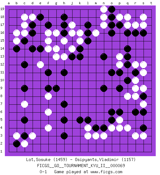 Last move : 0-1 2019 February 12 20:25:29 [Event "FICGS__GO__TOURNAMENT_KYU_II__000069"] [Site "FICGS"] [Date "2018.11.09"] [Round "1"] [Black "Lot,Sosuke"] [White "Osipyants,Vladimir"] [Result "0-1"] [Rating 1 "1459"] [Rating 2 "1157"] 1.q16 d3 2.d16 q4 3.c5 f4 4.c9 k16 5.r6 q8 6.p6 o4 7.s4 r3 8.s8 q11 9.q13 r17 10.r16 q17 11.p17 p18 12.o18 q18 13.o16 s17 14.s16 s18 15.h17 c17 16.d17 c16 17.c15 b15 18.b14 b16 19.d14 d18 20.e18 c18 21.h3 l3 22.h5 f6 23.h7 f8 24.g9 c7 25.f9 h15 26.k14 n17 27.o17 j17 28.h16 j16 29.j15 n18 30.o19 n19 31.l17 m16 32.l16 k15 33.l15 j14 34.k13 f15 35.f17 g13 36.j13 h13 37.h11 e12 38.c12 g16 39.h18 f16 40.e14 f14 41.f11 g14 42.n4 n3 43.o5 p4 44.m4 m3 45.o11 p12 46.n13 p13 47.q14 r9 48.n9 s9 49.p9 s7 50.s6 r8 51.r11 r12 52.q12 s12 53.q10 r10 54.p11 s11 55.k5 p5 56.o6 l4 57.l5 s3 58.c3 c2 59.b2 b3 0-1 Here are the names of the openings (joseki) played in the four corners : Corner d4 : d3 c5 Komoku (Somok, Xiao~mu`) 3-4 Point. The komoku (3-4) point is the traditional corner enclosure move.. Ikken Kakari (Hankan Keolch'im, Yi Gua`jiao~, 1-Space Low Pincer). The small knight move is the basic approach move to the 3-4 point stone. It has been continually used for over four centuries. There are limitless variations, with new moves constantly being discovered. Black 2 opens the door to a treaure store of joseki. Corner q4 : q4 r6 Hoshi (Hwajeom, Seongjeom, Xingwei`) 4-4 Point. The star or hoshi (4-4) point, emphasizing influence at the potential expense of territory. Ikken Kakari (Hankan Keolch'im, Yi Gua`jiao~, 1-Space Low Approach). Black 2 is the standard approach move to the 4-4. Corner q16 : q16 q11 Hoshi (Hwajeom, Seongjeom, Xingwei`) 4-4 Point. The star or hoshi (4-4) point, emphasizing influence at the potential expense of territory. Player White won this Go (weiqi, baduk) game. Follow this game move after move (download)The intersection is rarely neutral. (Pierre Audouard) A proverb is a short sentence based on long experience. (Miguel de Cervantes)