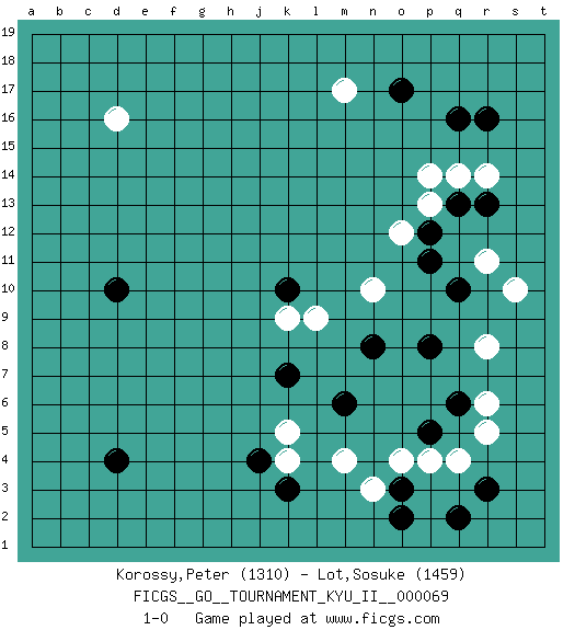 Last move : 1-0 2019 January 22 18:49:29 [Event "FICGS__GO__TOURNAMENT_KYU_II__000069"] [Site "FICGS"] [Date "2018.11.09"] [Round "1"] [Black "Korossy,Peter"] [White "Lot,Sosuke"] [Result "1-0"] [Rating 1 "1310"] [Rating 2 "1459"] 1.q16 d16 2.d4 q4 3.o3 r6 4.q2 r14 5.q13 q14 6.r13 p13 7.q10 p14 8.o17 r8 9.r3 s10 10.p12 o12 11.p11 r11 12.k10 n10 13.p8 o4 14.p5 p4 15.q6 r5 16.n8 l9 17.m6 n3 18.o2 k9 19.d10 m17 20.r16 m4 21.k3 k4 22.j4 k5 23.k7 1-0 This go game has been lost on time (started : 2018.11.09 19:2:39) Here are the names of the openings (joseki) played in the four corners : Corner q4 : q4 o3 Hoshi (Hwajeom, Seongjeom, Xingwei`) 4-4 Point. The star or hoshi (4-4) point, emphasizing influence at the potential expense of territory. Ikken Kakari (Hankan Keolch'im, Yi Gua`jiao~, 1-Space Low Approach). Black 2 is the standard approach move to the 4-4. Corner q16 : q16 r14 Hoshi (Hwajeom, Seongjeom, Xingwei`) 4-4 Point. The star or hoshi (4-4) point, emphasizing influence at the potential expense of territory. Ikken Kakari (Hankan Keolch'im, Yi Gua`jiao~, 1-Space Low Approach). White 2 is the standard approach move to the 4-4. Player Black won this Go (weiqi, baduk) game. Follow this game move after move (download)The carpenter's square becomes ko. (Anonymous) When you've done things right people won't know you've done anything at all. (Futurama)