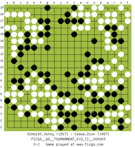 Last move : 0-1 2019 August 27 15:55:31 [Event "FICGS__GO__TOURNAMENT_KYU_II__000069"] [Site "FICGS"] [Date "2018.11.09"] [Round "1"] [Black "Schmidt,Jonny"] [White "Cease,Dion"] [Result "0-1"] [Rating 1 "1267"] [Rating 2 "1487"] 1.q4 d16 2.r16 d4 3.f17 p17 4.m17 q15 5.r15 q14 6.r14 q13 7.c10 r13 8.j17 r18 9.l3 r3 10.r4 q3 11.p3 p2 12.o3 o2 13.n3 f16 14.g16 e17 15.f15 e16 16.g17 c14 17.c8 f3 18.c12 s12 19.k9 e14 20.c5 c4 21.g13 s4 22.s5 s3 23.r6 b5 24.f7 h3 25.n10 r9 26.n2 n16 27.n12 m16 28.l17 n17 29.q9 q10 30.r10 s10 31.r8 r11 32.c17 b16 33.c16 c15 34.b17 b15 35.d13 d18 36.d15 e15 37.d14 b18 38.a17 c18 39.c13 b13 40.e13 f14 41.g15 b12 42.a15 b14 43.b11 d17 44.b6 c6 45.d5 b7 46.d6 a6 47.e4 e3 48.c7 b6 49.l15 p9 50.q8 o10 51.n9 p8 52.s18 r17 53.s17 s19 54.p7 o8 55.j3 h4 56.d3 c3 57.b8 o7 58.o6 n6 59.q16 p16 60.q19 q18 61.h2 g2 62.j4 h6 63.j6 g7 64.h7 g6 65.g8 f8 66.p18 q17 67.g9 e7 68.n18 o18 69.e8 f6 70.g4 h5 71.s14 t18 72.f9 d7 73.s9 d8 74.o11 e9 75.p11 p10 76.o1 q2 77.s2 t2 78.r19 p19 79.e10 p6 80.q6 q7 81.b4 e5 82.a5 e6 83.s7 t9 84.d9 s8 85.s1 t4 86.p1 r1 87.o5 r7 88.n7 n8 89.m7 m8 90.f2 j2 91.k2 h1 92.l8 a18 93.p5 a16 94.j1 k1 95.l1 j5 96.k6 k5 97.o14 s16 98.l5 t17 99.m9 k4 100.k3 l4 101.m5 m4 102.j1 h2 103.g19 m18 104.n19 l18 105.k18 l16 106.k17 o19 107.l19 m19 108.n19 n18 0-1 Here are the names of the openings (joseki) played in the four corners : Corner d16 : d16 f17 Hoshi (Hwajeom, Seongjeom, Xingwei`) 4-4 Point. The star or hoshi (4-4) point, emphasizing influence at the potential expense of territory. Ikken Kakari (Hankan Keolch'im, Yi Gua`jiao~, 1-Space Low Approach). Black 2 is the standard approach move to the 4-4. Corner q16 : r16 p17 Komoku (Somok, Xiao~mu`) 3-4 Point. The komoku (3-4) point is the traditional corner enclosure move.. Ikken Kakari (Hankan Keolch'im, Yi Gua`jiao~, 1-Space Low Pincer). The small knight move is the basic approach move to the 3-4 point stone. It has been continually used for over four centuries. There are limitless variations, with new moves constantly being discovered. White 2 opens the door to a treaure store of joseki. Corner d4 : d4 c8 Hoshi (Hwajeom, Seongjeom, Xingwei`) 4-4 Point. The star or hoshi (4-4) point, emphasizing influence at the potential expense of territory. Player White won this Go (weiqi, baduk) game. Follow this game move after move (download)Each step in a ladder is worth 7 points. (Anonymous) Knowledge will give you power, but character respect. (Bruce Lee)