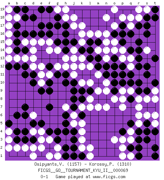 Last move : 0-1 2019 May 1 19:41:7 [Event "FICGS__GO__TOURNAMENT_KYU_II__000069"] [Site "FICGS"] [Date "2018.11.09"] [Round "1"] [Black "Osipyants,Vladimir"] [White "Korossy,Peter"] [Result "0-1"] [Rating 1 "1157"] [Rating 2 "1310"] 1.q16 d4 2.c16 q4 3.e17 o17 4.q14 q18 5.r17 r18 6.s18 s19 7.s17 k17 8.d10 k4 9.g4 f3 10.g3 c5 11.c7 k10 12.r10 r7 13.r3 q3 14.r4 r5 15.s5 s6 16.q2 p2 17.r2 o3 18.s4 q12 19.r12 q13 20.r13 p14 21.p15 o14 22.q11 o12 23.o10 m11 24.h16 g14 25.j15 d13 26.c12 c13 27.f4 e3 28.f7 o8 29.j7 d12 30.c11 h18 31.g17 j13 32.h10 f11 33.f9 j5 34.h6 k7 35.q8 p7 36.k8 l7 37.j2 k2 38.j3 k3 39.h5 b13 40.b12 a16 41.b16 a15 42.b17 a17 43.b15 a14 44.b14 b18 45.c18 a18 46.g18 j17 47.h17 j18 48.l15 m16 49.h14 h13 50.g15 j14 51.h15 f14 52.k14 q1 53.t2 p9 54.p10 q9 55.r9 r8 56.k1 l1 57.j1 l2 58.c3 b2 59.d3 e4 60.c4 b5 61.b4 e2 62.d5 d6 63.e5 d2 64.c6 c2 65.b6 g2 66.j4 j6 67.j9 l8 68.k9 l10 69.l9 m9 70.j10 k13 71.l13 m14 72.l14 l12 73.m13 o15 74.p17 p18 75.o16 n16 76.p16 l16 77.m15 n14 78.n12 n15 79.n11 e15 80.e16 j11 81.h11 h12 82.g11 g12 83.f10 e11 84.d11 n13 85.m12 n9 86.h2 g1 87.b19 d15 88.d16 s8 89.s9 e10 90.e9 k16 91.a12 a13 92.p12 p13 93.p11 q17 94.r15 f15 95.f16 n10 96.o11 t5 97.t4 t6 98.r1 p1 99.t18 n18 100.o9 t9 101.t10 t8 102.c14 d14 103.b3 a3 104.a5 g19 105.f19 h19 106.o13 a19 107.c19 a2 108.q10 p8 109.h1 o12 110.k6 k5 111.o13 f18 112.e19 o12 113.m8 m7 114.o13 d19 115.d18 o12 116.t19 r19 117.o13 h7 118.j8 o12 119.f2 f1 120.o13 s2 121.s3 k15 122.s11 o12 123.o18 o19 124.o13 h3 125.h4 o12 126.q5 r6 127.o13 t12 128.s12 o12 129.p4 p3 130.o13 t11 131.t13 o12 132.k11 j12 133.o13 r16 134.s16 o12 135.n8 n7 136.o13 e18 137.f17 o12 138.l11 k12 139.o13 s1 140.t1 o12 141.e1 d1 142.o13 s14 143.r14 o12 144.f12 e12 145.o13 a4 146.o12 c15 0-1 Here are the names of the openings (joseki) played in the four corners : Corner q16 : q16 o17 Hoshi (Hwajeom, Seongjeom, Xingwei`) 4-4 Point. The star or hoshi (4-4) point, emphasizing influence at the potential expense of territory. Ikken Kakari (Hankan Keolch'im, Yi Gua`jiao~, 1-Space Low Approach). White 2 is the standard approach move to the 4-4. Corner d4 : d4 g4 Hoshi (Hwajeom, Seongjeom, Xingwei`) 4-4 Point. The star or hoshi (4-4) point, emphasizing influence at the potential expense of territory. Niken Takagakari (Dukan Nop'dakeolch'im, E`r Gaojia, 2-Space High Approach). Black 2 is a light approach move. Rarely played in even games, Black 2 is typically employed in handicap games. White continues with 6-4 or 3-10. In Korean Sunjang Baduk White has a stone on 8-4. Player White won this Go (weiqi, baduk) game. Follow this game move after move (download)Don't reduce your own liberties. (Bill Taylor) If computers get too powerful, we can organize them into committees. That'll do them in. (Anonymous)