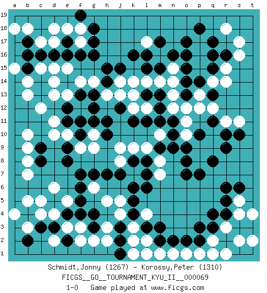 Last move : 1-0 2019 August 3 23:17:38 [Event "FICGS__GO__TOURNAMENT_KYU_II__000069"] [Site "FICGS"] [Date "2018.11.09"] [Round "1"] [Black "Schmidt,Jonny"] [White "Korossy,Peter"] [Result "1-0"] [Rating 1 "1267"] [Rating 2 "1310"] 1.q4 d4 2.q17 r15 3.d16 f17 4.g16 c17 5.f16 d17 6.j3 f3 7.c16 d10 8.r9 r11 9.p10 p12 10.n11 m8 11.b17 b18 12.k11 j8 13.l3 r3 14.k8 k7 15.l7 k9 16.l8 l9 17.j7 m7 18.l6 m10 19.m11 j9 20.h7 g9 21.o17 s17 22.p3 s5 23.g17 f18 24.r4 s4 25.c3 c4 26.h11 l12 27.l11 l17 28.d3 e3 29.f10 g10 30.g11 f9 31.b4 b5 32.e4 b3 33.f7 g6 34.d5 c5 35.g7 d13 36.e17 e18 37.e16 g14 38.k16 m16 39.o14 p16 40.o16 p15 41.o15 p17 42.p18 r18 43.r6 q2 44.q13 p13 45.p14 q14 46.q15 r14 47.r16 s16 48.g18 b14 49.f13 f14 50.e14 e13 51.q11 q12 52.f11 f12 53.g13 e15 54.e9 e10 55.q16 n12 56.e8 o11 57.n10 p8 58.m12 n13 59.m13 n14 60.m15 n15 61.n9 o10 62.b2 a4 63.o9 p9 64.n16 m14 65.l15 q10 66.e11 d11 67.o7 n1 68.c14 d14 69.p2 p1 70.c13 c12 71.e12 c15 72.b15 b13 73.m17 l14 74.r5 k2 75.c8 b9 76.f6 e5 77.f4 h2 78.g3 g2 79.s3 s2 80.e2 f2 81.s6 a18 82.t3 t2 83.j2 k3 84.k4 l2 85.m2 m1 86.l1 k1 87.j1 l1 88.n2 o1 89.o2 q1 90.q3 t4 91.g4 d2 92.h14 h13 93.g12 j14 94.h15 k13 95.c9 b10 96.r2 r1 97.f19 d18 98.l13 k12 99.j12 j13 100.o8 l4 101.m3 j4 102.k5 h3 103.o13 o12 104.j15 k14 105.s10 s11 106.p7 h5 107.f5 d6 108.q8 q9 109.r10 b7 110.l16 j5 111.m9 b8 112.h10 a15 113.b16 d15 114.k6 1-0 Here are the names of the openings (joseki) played in the four corners : Corner q16 : q17 r15 Komoku (Somok, Xiao~mu`) 3-4 Point. The komoku (3-4) point is the traditional corner enclosure move.. Ikken Kakari (Hankan Keolch'im, Yi Gua`jiao~, 1-Space Low Pincer). The small knight move is the basic approach move to the 3-4 point stone. It has been continually used for over four centuries. There are limitless variations, with new moves constantly being discovered. White 2 opens the door to a treaure store of joseki. Corner d16 : d16 f17 Hoshi (Hwajeom, Seongjeom, Xingwei`) 4-4 Point. The star or hoshi (4-4) point, emphasizing influence at the potential expense of territory. Ikken Kakari (Hankan Keolch'im, Yi Gua`jiao~, 1-Space Low Approach). White 2 is the standard approach move to the 4-4. Corner d4 : d4 j3 Hoshi (Hwajeom, Seongjeom, Xingwei`) 4-4 Point. The star or hoshi (4-4) point, emphasizing influence at the potential expense of territory. Player Black won this Go (weiqi, baduk) game. Follow this game move after move (download)Error is one of the sources of transformation. (Pierre Audouard) There is no vagueness without wind. (Chinese proverb)