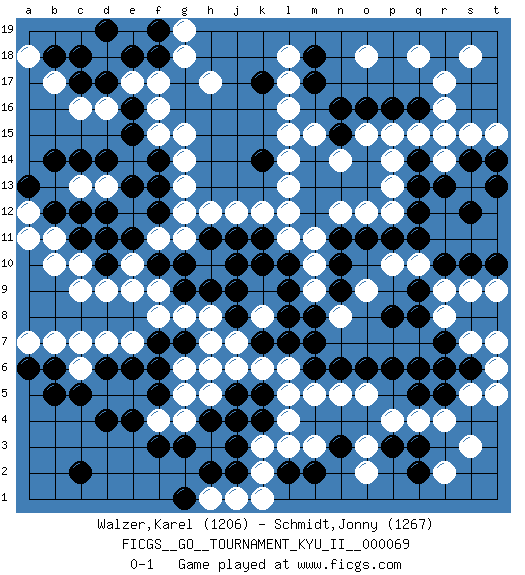 Last move : 0-1 2019 July 14 23:35:20 [Event "FICGS__GO__TOURNAMENT_KYU_II__000069"] [Site "FICGS"] [Date "2018.11.09"] [Round "1"] [Black "Walzer,Karel"] [White "Schmidt,Jonny"] [Result "0-1"] [Rating 1 "1206"] [Rating 2 "1267"] 1.d4 d16 2.q3 r16 3.q16 q15 4.p16 r17 5.q14 p15 6.o16 c9 7.d14 h17 8.c17 c16 9.d17 r15 10.e16 e17 11.e18 f17 12.f18 f16 13.e15 f15 14.f14 g14 15.f13 g13 16.f12 g12 17.k17 f11 18.e11 e10 19.f10 g11 20.d10 e9 21.d11 d9 22.g9 k8 23.j4 b11 24.b14 c13 25.c14 b17 26.b18 e12 27.d12 a18 28.c18 g18 29.d19 g8 30.h9 h8 31.j10 k12 32.l10 n8 33.n10 f9 34.k10 o9 35.m13 p10 36.q11 h10 37.j8 j7 38.j9 d13 39.e13 o12 40.m12 m15 41.k14 l14 42.o13 p13 43.n15 n14 44.m14 o15 45.n16 l15 46.o14 p14 47.n13 l17 48.m17 l18 49.m18 m11 50.n11 l11 51.l8 m10 52.k7 k6 53.l7 m9 54.q12 h6 55.m6 m5 56.n6 l6 57.m7 n5 58.o6 o5 59.p6 q4 60.q5 r4 61.p3 p4 62.n3 r8 63.r7 r6 64.r5 s5 65.s6 s7 66.q6 t6 67.r6 s3 68.s8 t7 69.t8 t5 70.q8 r9 71.q9 q10 72.r10 s9 73.s10 t9 74.p8 n12 75.l9 l13 76.o11 p12 77.p11 q18 78.n9 o18 79.m8 j12 80.g10 m3 81.m2 c10 82.c12 l3 83.l2 k3 84.j3 k2 85.j2 j1 86.h2 b7 87.b5 g5 88.f3 l16 89.q13 d7 90.s14 r14 91.r13 s13 92.s12 s15 93.t13 r2 94.q2 s18 95.k11 l12 96.h11 o2 97.e6 e7 98.f6 g6 99.f7 f8 100.k5 l5 101.j5 j6 102.c2 h12 103.j11 o3 104.b12 a12 105.a13 a11 106.c11 b10 107.d6 c6 108.c5 n14 109.f5 g4 110.g3 f4 111.e4 g15 112.b6 c7 113.h4 h1 114.g1 k1 115.g7 h7 116.k4 t15 117.t14 g19 118.f19 a7 119.a6 l4 120.t10 h5 0-1 Here are the names of the openings (joseki) played in the four corners : Corner q16 : r16 q16 Komoku (Somok, Xiao~mu`) 3-4 Point. The komoku (3-4) point is the traditional corner enclosure move.. Corner d4 : d4 c9 Hoshi (Hwajeom, Seongjeom, Xingwei`) 4-4 Point. The star or hoshi (4-4) point, emphasizing influence at the potential expense of territory. Corner d16 : d16 d14 Hoshi (Hwajeom, Seongjeom, Xingwei`) 4-4 Point. The star or hoshi (4-4) point, emphasizing influence at the potential expense of territory. Ikken Takagakari (Hankan Nop'dakeolch'im, Yi Gaojia, 1-Space High Approach). White typically responds at 6-4 or 3-10. White 4-10 is played when White finds play on the right side advantageous. White 4-8 or 3-8 may be played when White has support at top. Corner q4 : q3 n8 Komoku (Somok, Xiao~mu`) 3-4 Point. The komoku (3-4) point is the traditional corner enclosure move.. Player White won this Go (weiqi, baduk) game. Follow this game move after move (download)Capture what you cut off. (Anonymous) I find television to be very educating. Every time somebody turns on the set, I go in the other room and read a book. (Groucho Marx)