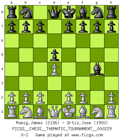 Last move : 0-1 2019 January 19 6:29:23 [Event "FICGS__CHESS__THEMATIC_TOURNAMENT__000229"] [Site "FICGS"] [Date "2018.11.10"] [Round "1"] [White "Romig,James"] [Black "Ortiz,Jose"] [Result "0-1"] [WhiteElo "2136"] [BlackElo "1900"] 1.d4 d5 2.g4 Bxg4 0-1 Queen's pawn game Player Black won this chess game. Follow this game move after move (download)Of Chess it has been said that life is not long enough for it, but that is the fault of life, not Chess. (William Ewart Napier) Im Schach gewinnt jeder. Hat man Freunde am Spiel - und das ist die Hauptsache - ist auch der Verlust einer Partie kein Unglück. (David Bronstein) Robert Fischer es la ley hacia si mismo. (Larry Evans) Aux échecs, l'amour-propre est satisfait quand on remporte la victoire, mais il n'y a pas de honte à être battu. (Benjamin Franklin) There is far too much law for those who can afford it and far too little for those who cannot. (Derek Bok)