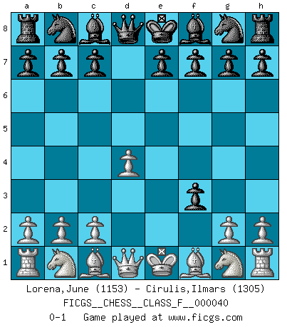 Last move : 0-1 2007 July 17 23:22:22 [Event "FICGS__CHESS__CLASS_F__000040"] [Site "FICGS"] [Date "2007.05.23"] [Round "1"] [White "Lorena,June"] [Black "Cirulis,Ilmars"] [Result "0-1"] [WhiteElo "1153"] [BlackElo "1305"] 1.d4 d5 2.e4 dxe4 3.f3 exf3 0-1 This chess game has been lost on time (started : 2007.05.23 23:11:20) Blackmar gambit Player Black won this chess game. Follow this game move after move (download)There's never before been a Chess player with such a thorough knowledge of the intricacies of the game and such an absolutely indomitable will to win. I think Bobby is the greatest player that ever lived. (Lisa Lane) Die Neutralität betrachte ich als eine schwere Krankheit. (Viktor Kortschnoi) Es muy difícil jugar en contra de la teoría de Einstein. - en su primera derrota en contra de Fischer (Mikhail Tal) Il n'y a plus de joueurs du niveau de Jacob Murray dont la seule quête est le beau jeu, le plaisir de voir les pièces construire quelque chose. Sur 10 idées à la minute, 9 seront sans intérêt, la dernière s'avèrera géniale. (Christian Bauer) He who defends everything defends nothing. (Frederick the Great)