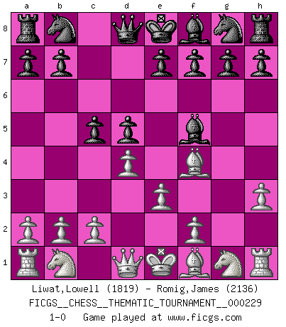 Last move : 1-0 2019 January 12 5:17:40 [Event "FICGS__CHESS__THEMATIC_TOURNAMENT__000229"] [Site "FICGS"] [Date "2018.11.10"] [Round "1"] [White "Liwat,Lowell"] [Black "Romig,James"] [Result "1-0"] [WhiteElo "1819"] [BlackElo "2136"] 1.d4 d5 2.g4 Bxg4 3.h3 Bf5 4.Bf4 c5 5.e3 1-0 Queen's pawn game Player White won this chess game. Follow this game move after move (download)He who takes the Queen's Knight's Pawn will sleep in the streets. (Anonymous) Ein Schachgenie ist jemand der verdammt gut Schach spielt. (Jonathan Levitt) ¿Se han dado cuenta de que Fischer casi nunca ha tenido piezas malas? El las intercambia y las piezas malas se quedan con sus oponenets. (Yuri Balashov) C'est une question de caractère, Beaucoup de gens perdent leur motivation très vite. D'autres, ils sont rares, peuvent la conserver très longtemps. J'aime les échecs, encore aujourd'hui je suis heureux d'analyser des parties. J'aime toujours gagner, je déteste encore perdre. Bien jouer est important pour mon intégrité intellectuelle et morale. Et puis les échecs vivent en ce moment une période historique grâce à Internet. Ils se développent dans les systèmes éducatifs à travers le monde. Ils sortent de leur ghetto, et c'est mon rôle de mener à bien cette révolution. (Gary Kasparov) Those who make the worst use of their time are the first to complain of its brevity. (Jean de la Bruyere)