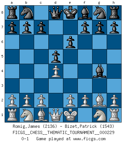 Last move : 0-1 2019 January 13 5:26:39 [Event "FICGS__CHESS__THEMATIC_TOURNAMENT__000229"] [Site "FICGS"] [Date "2018.11.11"] [Round "1"] [White "Romig,James"] [Black "Bizet,Patrick"] [Result "0-1"] [WhiteElo "2136"] [BlackElo "1543"] 1.d4 d5 2.g4 Bxg4 3.Bg2 e6 0-1 Queen's pawn game Player Black won this chess game. Follow this game move after move (download)When you see a good move, look for a better one. (Emanuel Lasker) Der Freibauer hat für mich eine Seele, genau wie der Mensch, Wünsche, die unerkannt in ihm schlummern, und Befürchtungen, von deren Existenz er selbst kaum ahnt. (Aaron Nimzowitsch) Cuando estes solo, cuando te sientas un extraño en el mundo, juega al Ajedrez. Esto levantará tu espiritu y será tu consejero de guerra. (Aristóteles) Une platitude souvent récitée à propos des Echecs est qu'une des choses les plus difficiles à réaliser est de gagner une position gagnante. Cela ne manque pas de sens mais, pour ma part, j'ai toujours trouvé plus difficile de gagner une position perdante. (Tim Krabbe) Wipe them out. All of them. (Darth Sidious in Star Wars ep.1)
