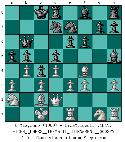 Last move : 1-0 2019 March 26 12:29:23 [Event "FICGS__CHESS__THEMATIC_TOURNAMENT__000229"] [Site "FICGS"] [Date "2018.11.10"] [Round "1"] [White "Ortiz,Jose"] [Black "Liwat,Lowell"] [Result "1-0"] [WhiteElo "1900"] [BlackElo "1819"] 1.d4 d5 2.g4 Bxg4 3.Bf4 e6 4.h3 Bh5 5.Nc3 c6 6.Qd2 f6 7.a3 Nd7 8.O-O-O Qa5 9.f3 b5 10.Na2 Qb6 11.e3 a5 12.c3 Ne7 13.Re1 O-O-O 14.Bd3 c5 15.b4 c4 16.Bc2 1-0 Queen's pawn game Queenside Castling by player White (move 8) Queenside Castling by player Black (move 13) Player White won this chess game. Follow this game move after move (download)The blunders are all there on the board, waiting to be made. (Savielly Tartakover) Der Knackpunkt bei der Konzentration ist, daß wir nur durch sie etwas Neues und Ungewöhnliches am Schachbrett finden können. Sie ist der einzige Weg durch neue neue Ideen eine Überraschung zu bereiten. (Garry Kasparov) ¡Examina movidas que hagan daño! Un buen ojo for movidas desvastantes es mucho mas importante que el conocimiento de principios estratégicos. (Purdy) Tout change constamment, y compris dans le monde des Echecs. (Botvinnik) Over-the-board chess is the favorite of mortals, correspondence chess is the favorite of the gods. (Eduard Dyckhoff)