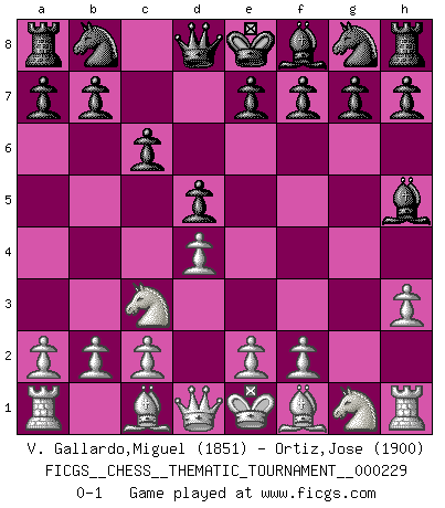 Last move : 0-1 2019 January 6 16:13:14 [Event "FICGS__CHESS__THEMATIC_TOURNAMENT__000229"] [Site "FICGS"] [Date "2018.11.10"] [Round "1"] [White "V. Gallardo,Miguel"] [Black "Ortiz,Jose"] [Result "0-1"] [WhiteElo "1851"] [BlackElo "1900"] 1.d4 d5 2.g4 Bxg4 3.h3 Bh5 4.Nc3 c6 0-1 This chess game has been lost on time (started : 2018.11.10 14:4:39) Queen's pawn game Player Black won this chess game. Follow this game move after move (download)Chess is above all, a fight ! (Emanuel Lasker) Ich verlor meine Bürgerrechte, mein Gehalt wurde mir nicht mehr bezahlt und ich wurde zensiert und durfte nicht mehr ins Ausland reisen. [nach dem Match Fischer-Taimanov 6:0] (Mark Taimanov) Solo los afeminados hacen el Enroque. (Rob Sillars) Celui qui prend des risques peut perdre, celui qui n'en prend pas perd toujours. (Xavier Tartacover) An expert is a man who has made all the mistakes which can be made in a very narrow field. (Niels Bohr)