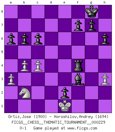Last move : 0-1 2019 May 17 9:4:38 [Event "FICGS__CHESS__THEMATIC_TOURNAMENT__000229"] [Site "FICGS"] [Date "2018.11.10"] [Round "1"] [White "Ortiz,Jose"] [Black "Horoshilov,Andrey"] [Result "0-1"] [WhiteElo "1900"] [BlackElo "1694"] 1.d4 d5 2.g4 Bxg4 3.h3 Bh5 4.Bf4 h6 5.Bg2 Nf6 6.f3 Nc6 7.e3 e6 8.Ne2 Bd6 9.Nbc3 Bg6 10.Ng3 Bxf4 11.exf4 Nh5 12.Nge2 O-O 13.a3 Qh4+ 14.Kd2 Ng3 15.Qe1 Nf5 16.Rd1 Qxe1+ 17.Rdxe1 Nfxd4 18.Nxd4 Nxd4 19.Rc1 a6 20.Na4 b6 21.c3 Nb3+ 22.Ke3 Nxc1 23.Rxc1 Rfe8 24.b4 Rad8 25.Bf1 e5 26.Kf2 e4 27.Be2 e3+ 28.Kg2 d4 29.Rd1 d3 30.Bf1 e2 31.Bxe2 dxe2 32.Re1 Rd1 33.Kf2 Rxe1 34.Kxe1 Bh5 35.c4 Bxf3 36.Nc3 c6 37.Na4 Re4 38.Nb2 Rxf4 0-1 This chess game has been lost on time (started : 2018.11.10 14:4:39) Queen's pawn game Kingside Castling by player Black (move 12) Player Black won this chess game. Follow this game move after move (download)It's just you and your opponent at the board and you're trying to prove something. (Bobby Fischer) Wer sich die Fähigkeit anerziehen will im Schach selbstständig zu denken, der muß alles meiden, was leblos ist: ausgeklügelte Theorien, die sich auf sehr wenige Beispiele und eine Menge Hirngespinste stützen. (Emanuel Lasker) Cuando no sepas que mover, espera por una idea que se le venga a la la cabeza de tu oponente. Tenlo por seguro de que esa idea estará incorrecta. (Siegbert Tarrasch) Des idées, des idées, j'en ai cent, j'en ai mille. Des bonnes, des mauvaises, applicables, irréalisables... Il suffit de faire le tri ! (Roos) Experiences are the keys to life. (Daniel Parmet)