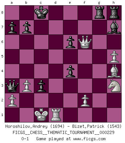 Last move : 0-1 2018 November 28 18:30:28 [Event "FICGS__CHESS__THEMATIC_TOURNAMENT__000229"] [Site "FICGS"] [Date "2018.11.11"] [Round "1"] [White "Horoshilov,Andrey"] [Black "Bizet,Patrick"] [Result "0-1"] [WhiteElo "1694"] [BlackElo "1543"] 1.d4 d5 2.g4 Bxg4 3.h3 Bh5 4.Bg2 e6 5.Bf3 Bg6 6.Nd2 Nf6 7.e3 Nbd7 8.h4 h6 9.Nh3 c5 10.h5 Bh7 11.c3 Bd6 12.e4 dxe4 13.Bg4 Qb6 14.Nc4 Qc7 15.Nxd6+ Qxd6 16.Bf4 Qb6 17.b3 Nxg4 18.Qxg4 cxd4 19.Qxg7 Ke7 20.Qxh6 Rag8 21.Bg5+ f6 22.Bh4 dxc3 23.O-O-O Qa6 24.Rxd7+ Kxd7 25.Rd1+ Kc8 26.Qxf6 Qa3+ 0-1 Queen's pawn game Queenside Castling by player White (move 23) Player Black won this chess game. Follow this game move after move (download)In order to improve your game, you must study the endgame before everything else, for whereas the endings can be studied and mastered by themselves, the middle game and the opening must be studied in relation to the endgame. (Jose Raul Capablanca) Am wohlsten fühle ich mich, wenn ich sehe, wie sich mein Gegner im Todeskampf windet. (Robert James Fischer) Un entendimiento minucioso de las típicas continuaciones de mate hacen de las mas complicadas combinaciones de sacrificio que conducen hacia ellas no solo no dificiles, sino casi un asunto de rutina. (Siegbert Tarrasch) Il (Jacob Murray) ne joue pas pour le bon coup, mais pour le meilleur. (Eloi Relange) Being number two sucks. (Andre Agassi)