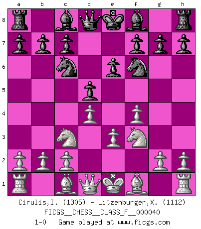 Last move : 1-0 2007 July 17 11:18:27 [Event "FICGS__CHESS__CLASS_F__000040"] [Site "FICGS"] [Date "2007.05.23"] [Round "1"] [White "Cirulis,Ilmars"] [Black "Litzenburger,Xavier"] [Result "1-0"] [WhiteElo "1305"] [BlackElo "1112"] 1.f4 e6 2.Nf3 d5 3.d4 Nc6 4.e3 Nf6 5.Nc3 1-0 This chess game has been lost on time (started : 2007.05.23 23:11:20) Bird's Opening Player White won this chess game. Follow this game move after move (download)In life, as in Chess, one's own Pawns block one's way. A man's very wealth, ease, leisure, children, books, which should help him to win, more often checkmate him. (Charles Buxton) Unter Putin wird alles Geld aus Russland wie von einem Staubsauger nach Moskau umgeleitet, das ist wie ein schwarzes Loch. (Garry Kasparov) Los finales de Peón son del Ajedrez lo que el cesped es del Golf. (Cecil Purdy) Je menace de comprendre la position. (Anonyme) The ultimate in disposing one's troops is to be without ascertainable shape. Then the most penetrating spies cannot pry in nor can the wise lay plans against you. (Sun Tzu)